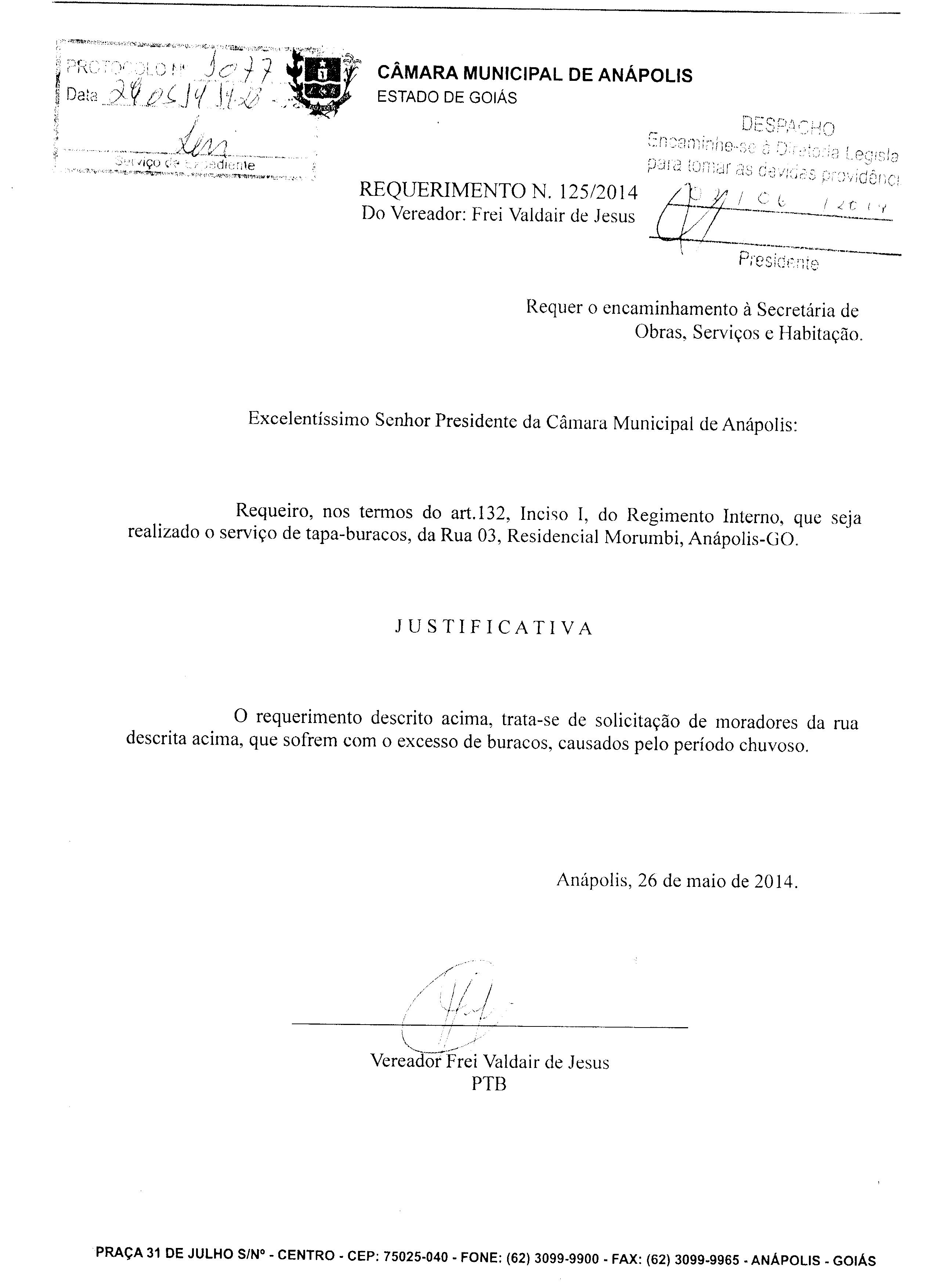 Ementa: QUE SEJA REALIZADO O SERVIÇO DE TAPA-BURACOS, DA RUA 03, RESIDENCIAL MORUMBI, ANÁPOLIS-GO.