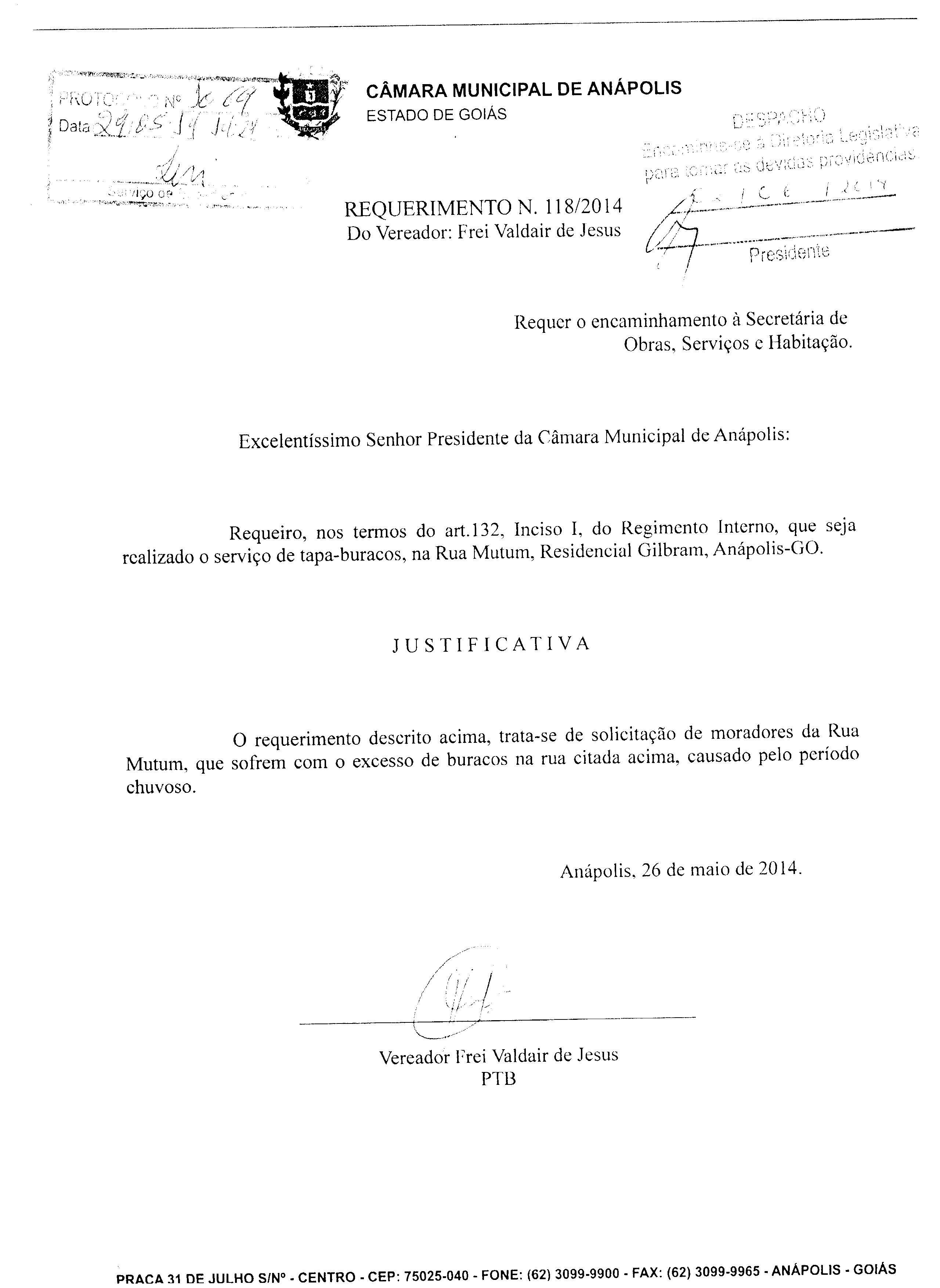Ementa: QUE SEJA REALIZADO O SERVIÇO DE TAPA-BURACOS, NA RUA MUTUM, RESIDENCIAL GILBRAM, ANÁPOLIS-GO.