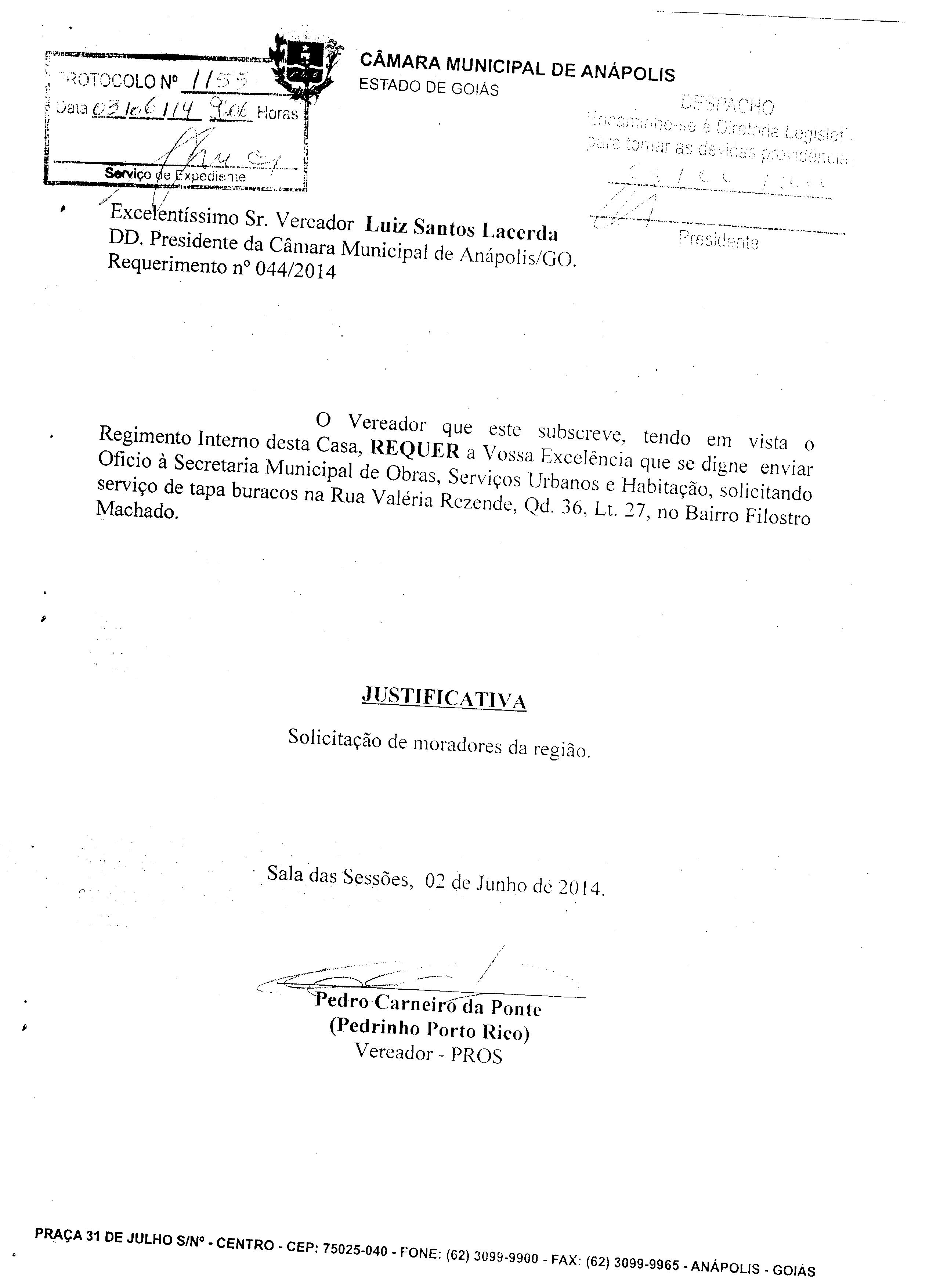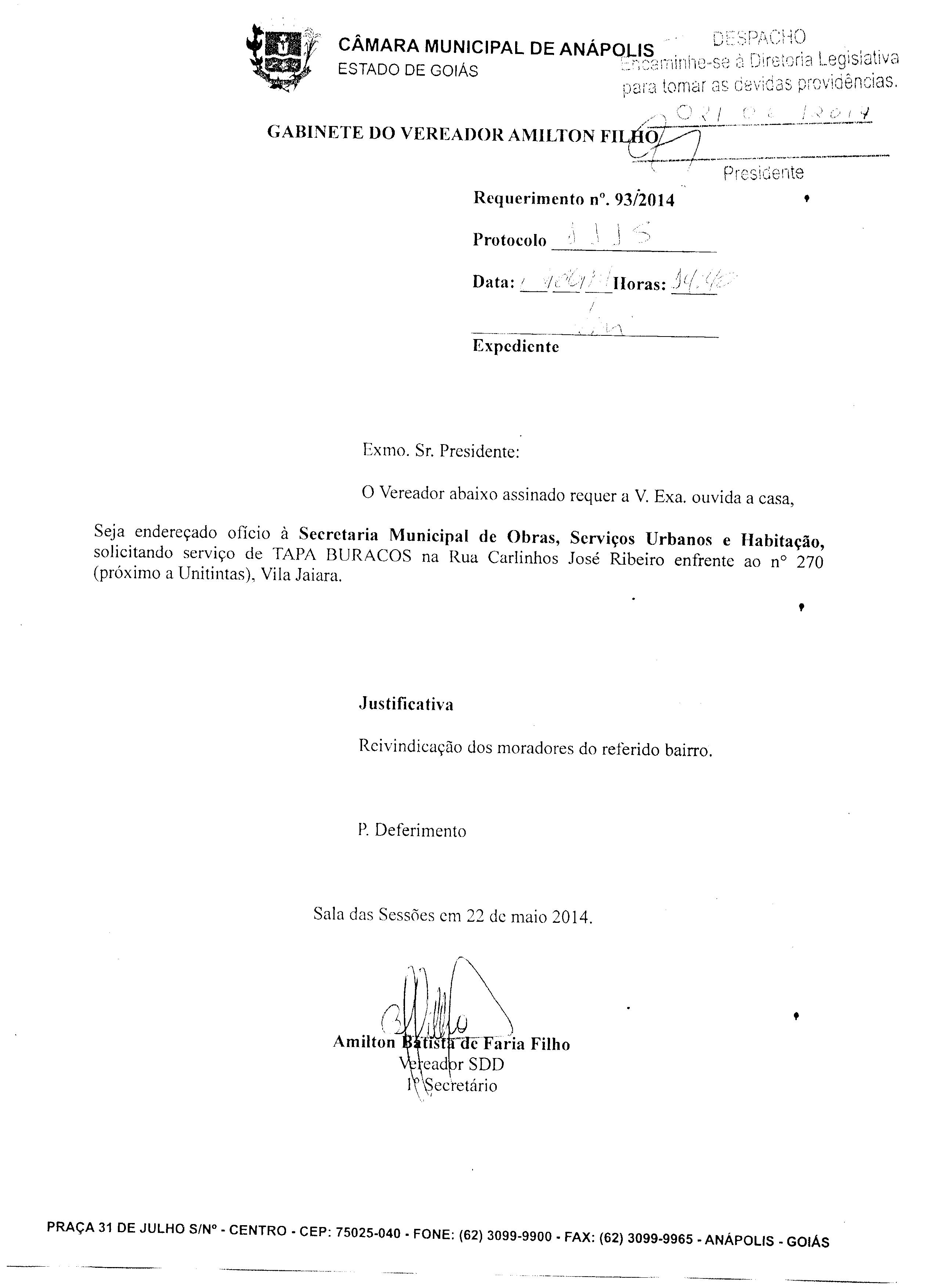 Ementa: À SECRETARIA MUNICIPAL DE OBRAS, SERVIÇOS URBANOS E HABITAÇÃO, SOLICITANDO SERVIÇO DE TAPA BURACOS NA RUA CORONEL JOAQUIM CRISPIM, QD. 62, LT. 05, BAIRRO JUNDIAÍ. PROTOCOLO 156 Nº 5177/14.
