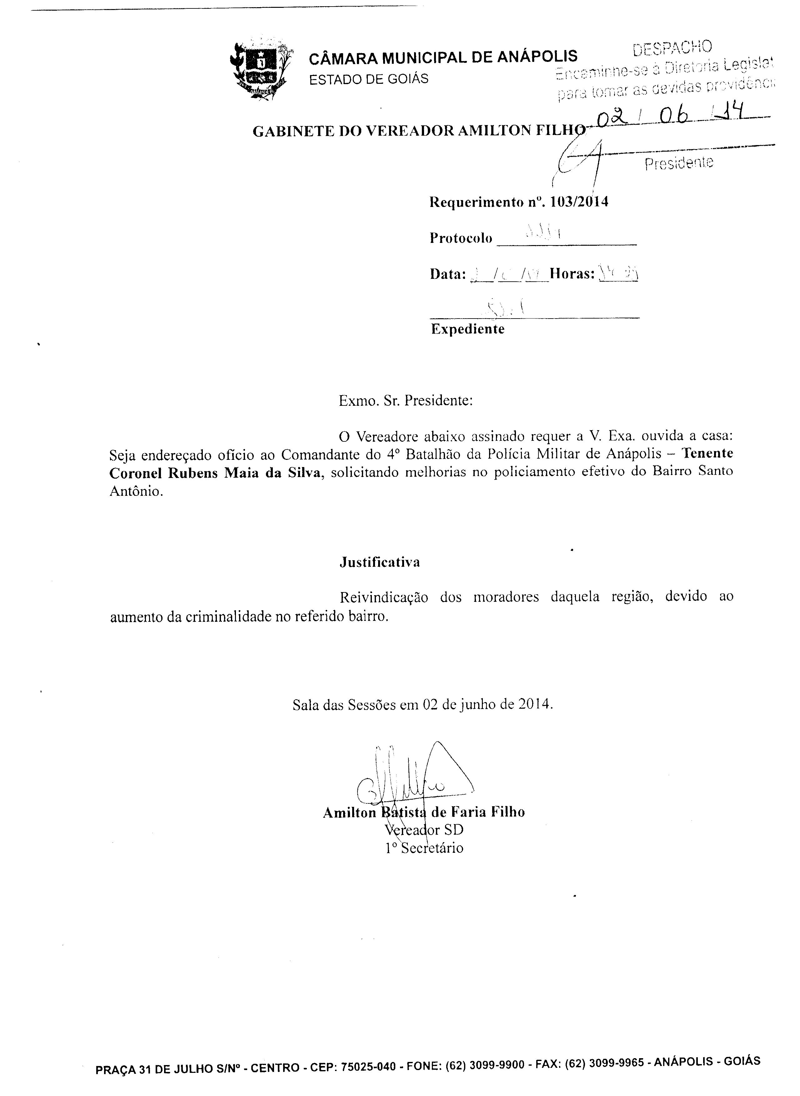 Ementa: O VEREADOR ABAIXO ASSINADO REQUER A V. EXA., OUVIDA A CASA, SEJA ENDEREÇADO OFÍCIO AO COMANDANTE DO 4º BATALHÃO DA POLÍCIA MILITAR DE ANÁPOLIS - TENENTE CORONEL RUBENS MAIA DA SILVA, SOLICITANDO MELHORIAS NO POLICIAMENTO EFETIVO DO BAIRRO SANTO ANTÔNIO.