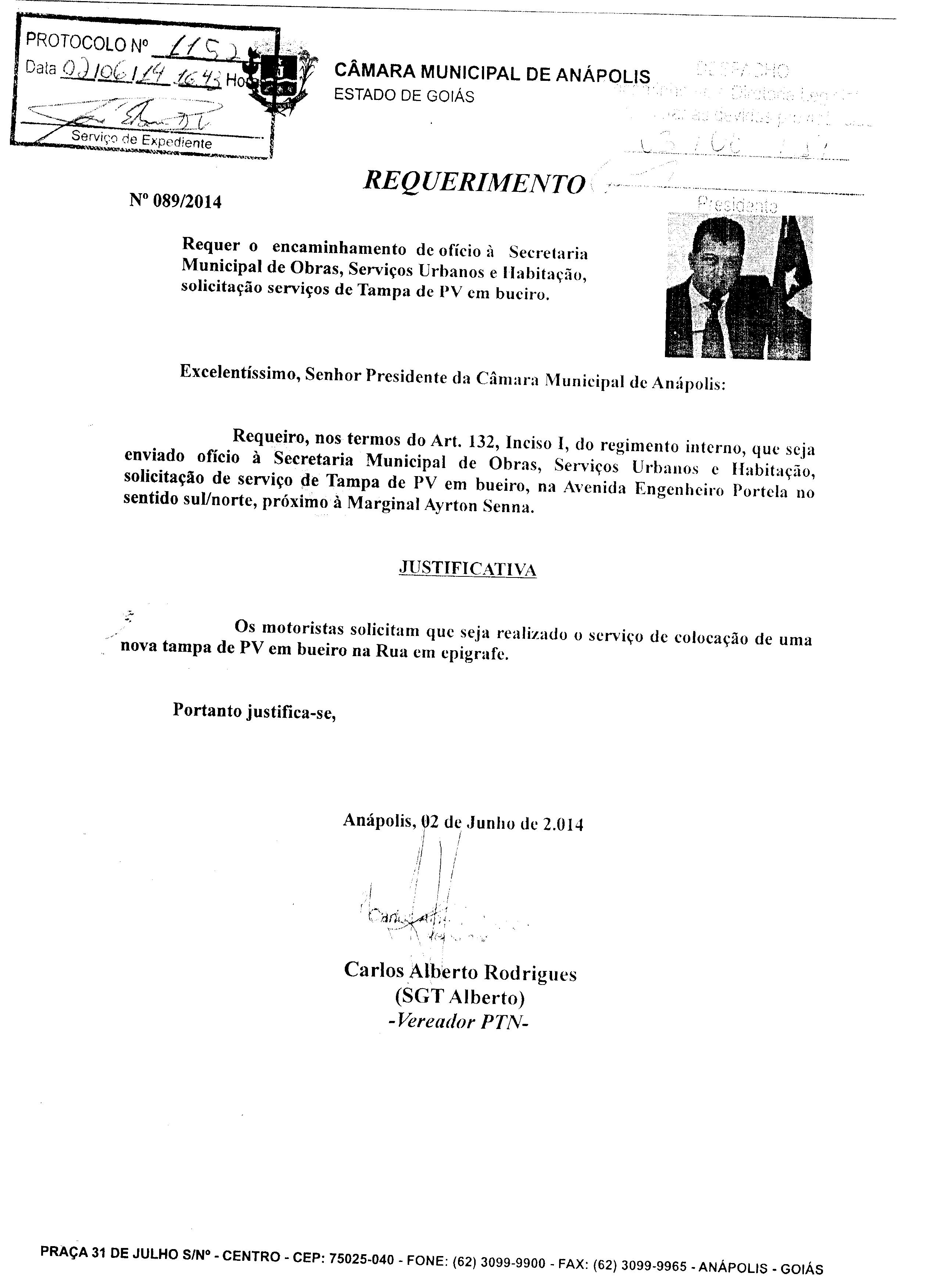 Ementa: À SECRETARIA MUNICIPAL DE OBRAS, SERVIÇOS URBANOS E HABITAÇÃO, SOLICITAÇÃO DE SERVIÇO DE TAMPA DE PV EM BUEIRO, NA AVENIDA ENGENHEIRO PORTELA NO SENTIDO SUL/NORTE, PRÓXIMO À MARGINAL AYRTON SENNA.