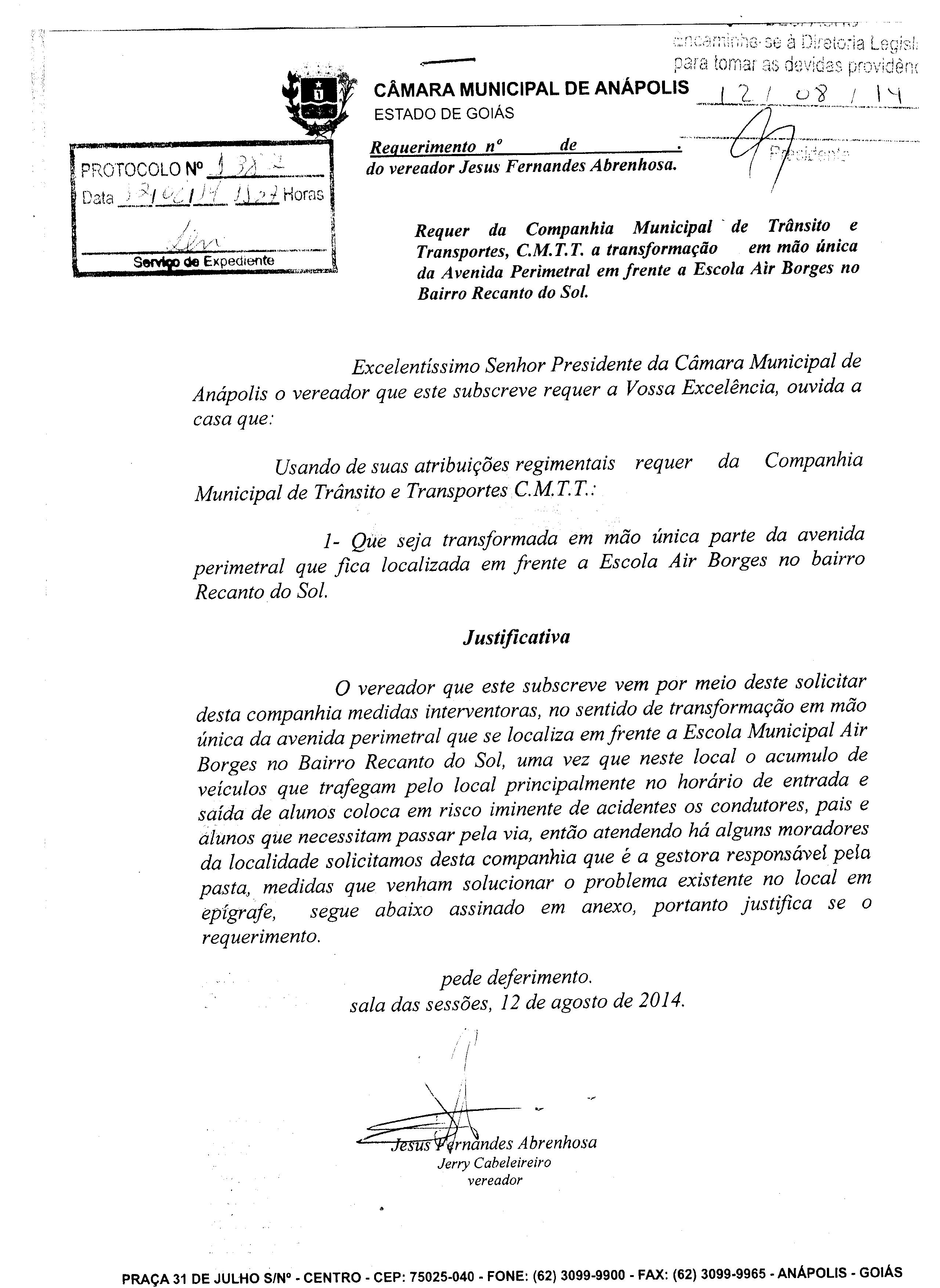 Ementa: À COMPANHIA MUNICIPAL DE TRÂNSITO E TRANSPORTES C.M.T.T: QUE SEJA TRANSFORMADA EM MÃO ÚNICA PARTE DA AVENIDA PERIMETRAL QUE FICA LOCALIZADA EM DRENTE A ESCOLA AIR BORGES NO BAIRRO RECANTO DO SOL.