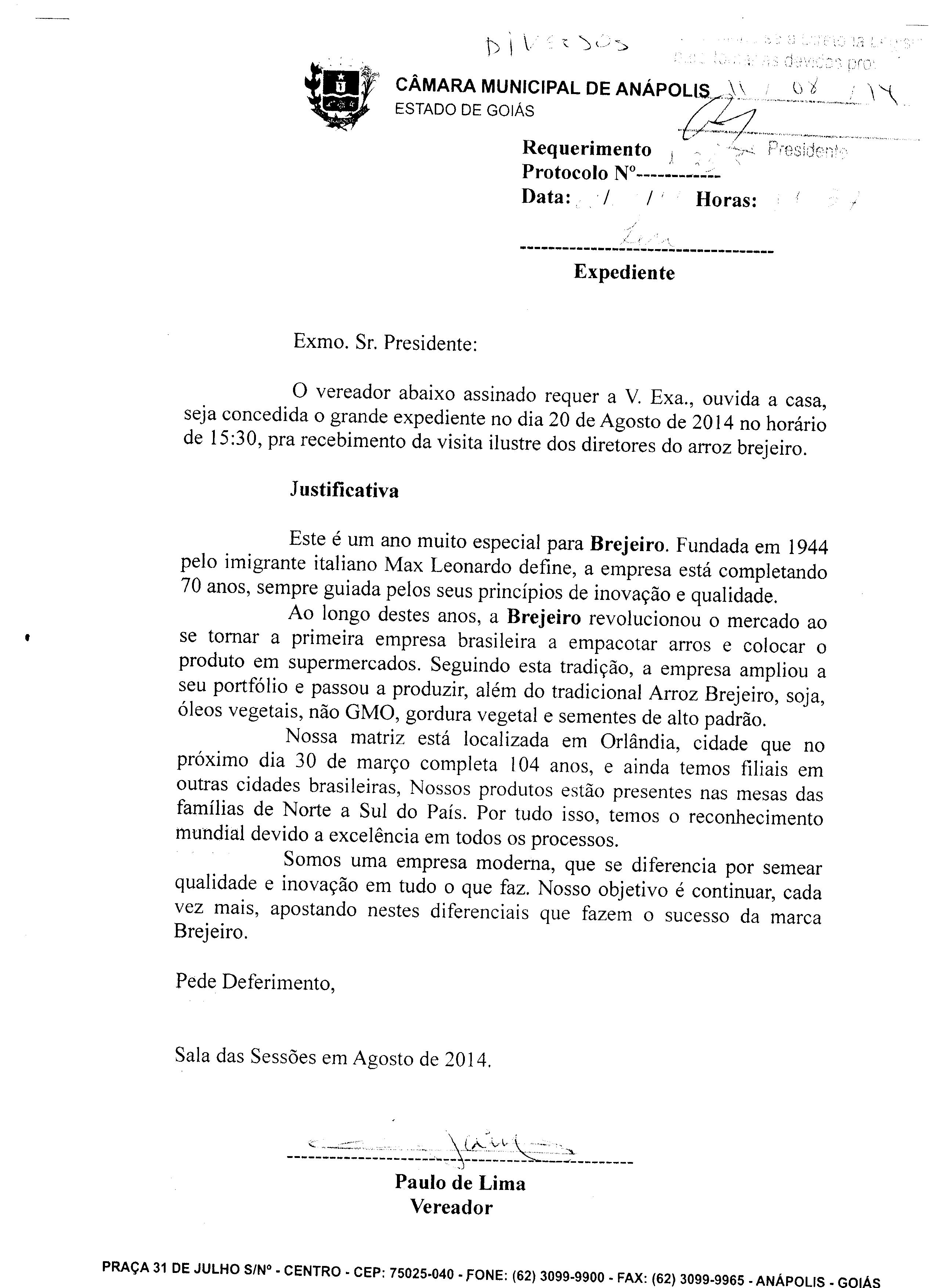 Ementa: QUE SEJA CONCEDIDA O GRANDE EXPEDIENTE NO DIA 20 DE AGOSTO DE 2014 NO HORÁRIO DE 15:30, PARA RECEBIMENTO DA VISITA DOS DIRETORES DO ARROZ BREJEIRO.