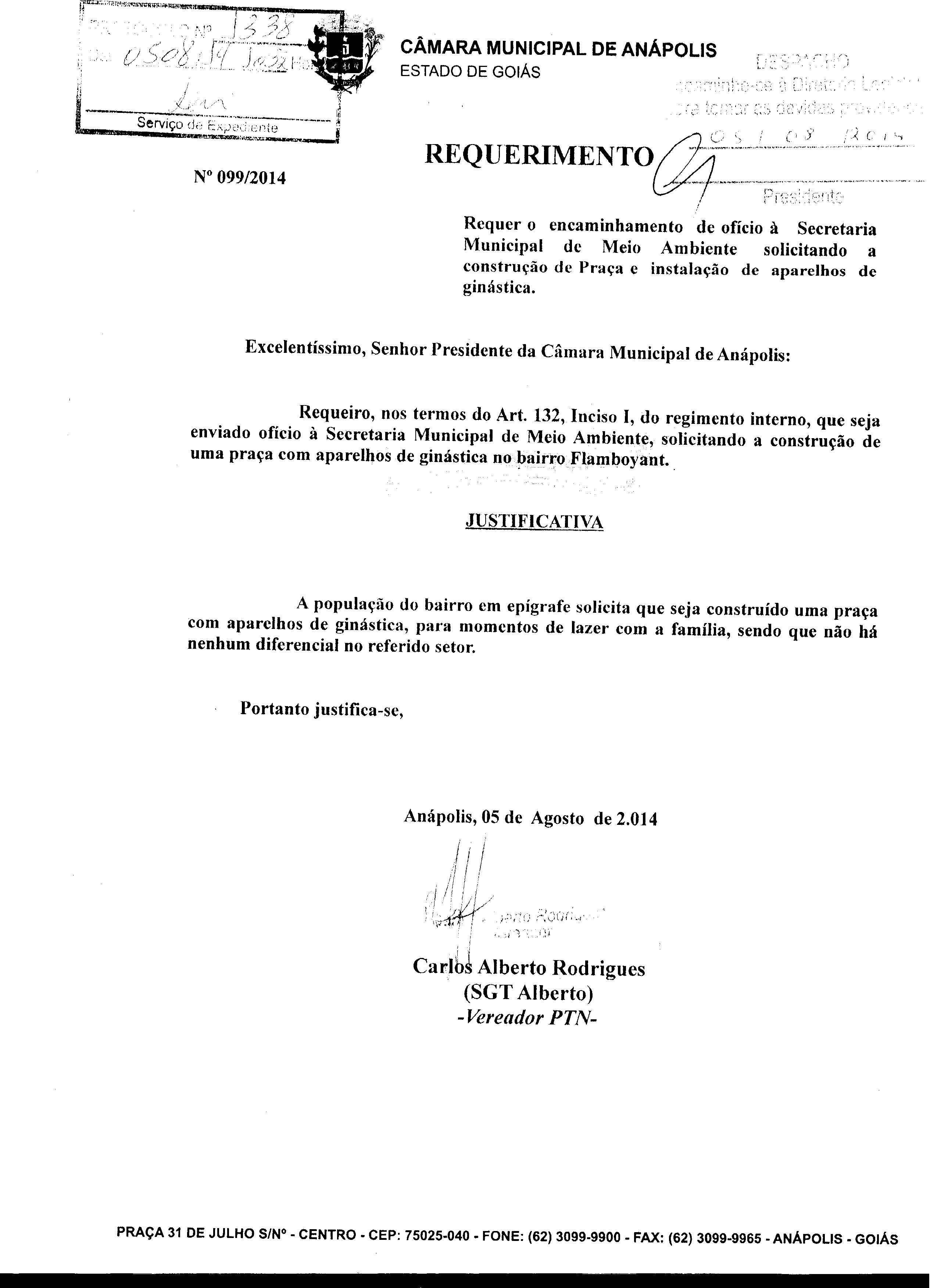Ementa: À SECRETARIA MUNICIPAL DE MEIO AMBIENTE, SOLICITANDO A CONSTRUÇÃO DE UMA PRAÇA COM APARELHOS DE GINÁSTICA NO BAIRRO FLAMBOYANT.