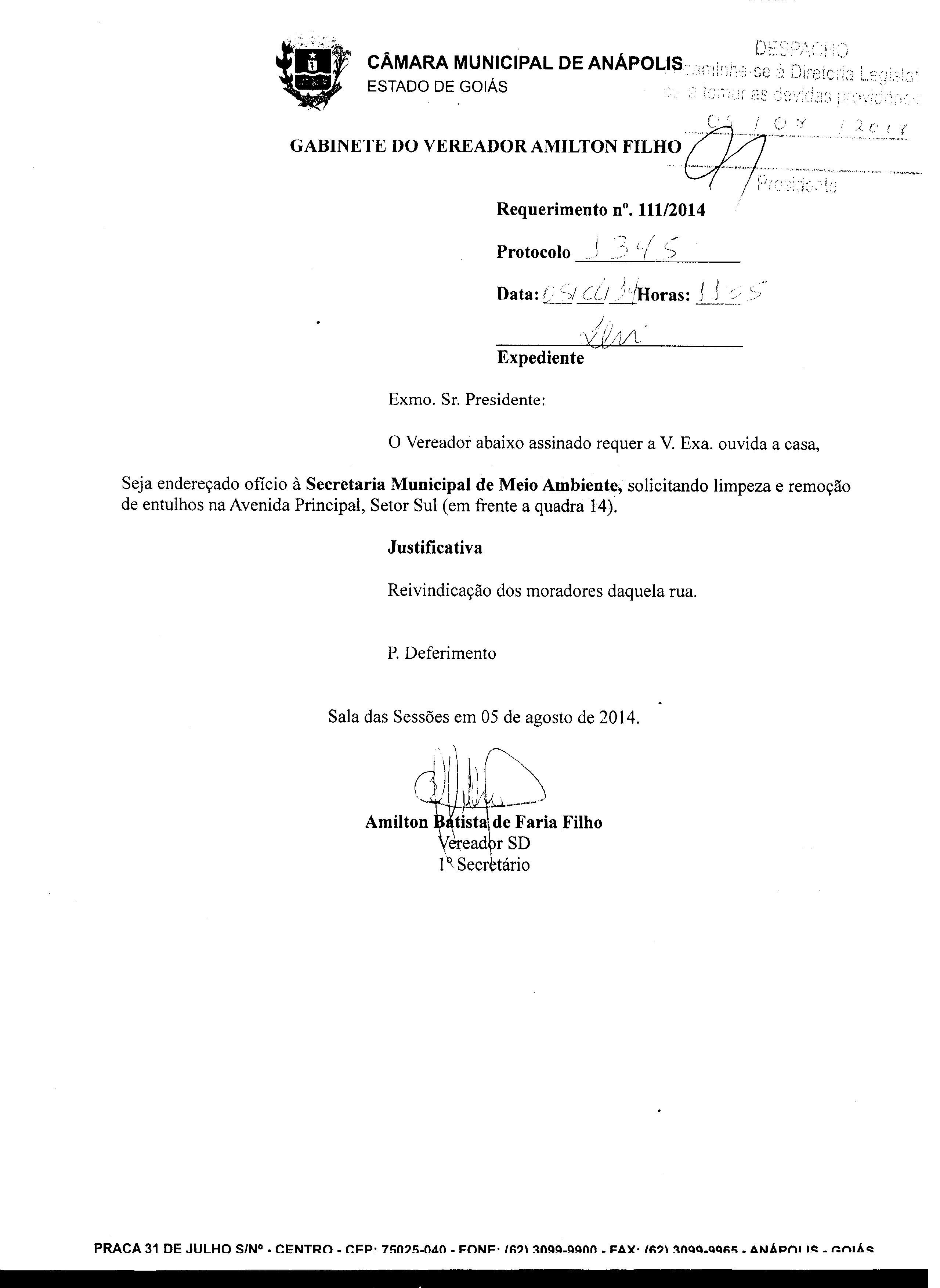 Ementa: REQUEIRO NOS TERMOS DO ART. 132, INCISO V, DO REGIMENTO INTERNO DESTA CASA DE LEI, SOLICITANDO AUTORIZAÇÃO PARA REALIZAÇÃO DE UMA AUDIÊNCIA PUBLICA, NO DIA 13 DE AGOSTO DE 2014 ÀS 09:00 HORAS, NA ASSOCIAÇÃO COMERCIAL DE ANÁPOLIS - ACIA, PARA RECEBERMOS O PRESIDENTE DA SANEAGO, JULIO VAZ, E TODA SUA DIRETORIA, PARA EXPLANAR SOBRE A REAL SITUAÇÃO DO ABASTECIMENTO DE ÁGUA EM ANÁPOLIS-GO.