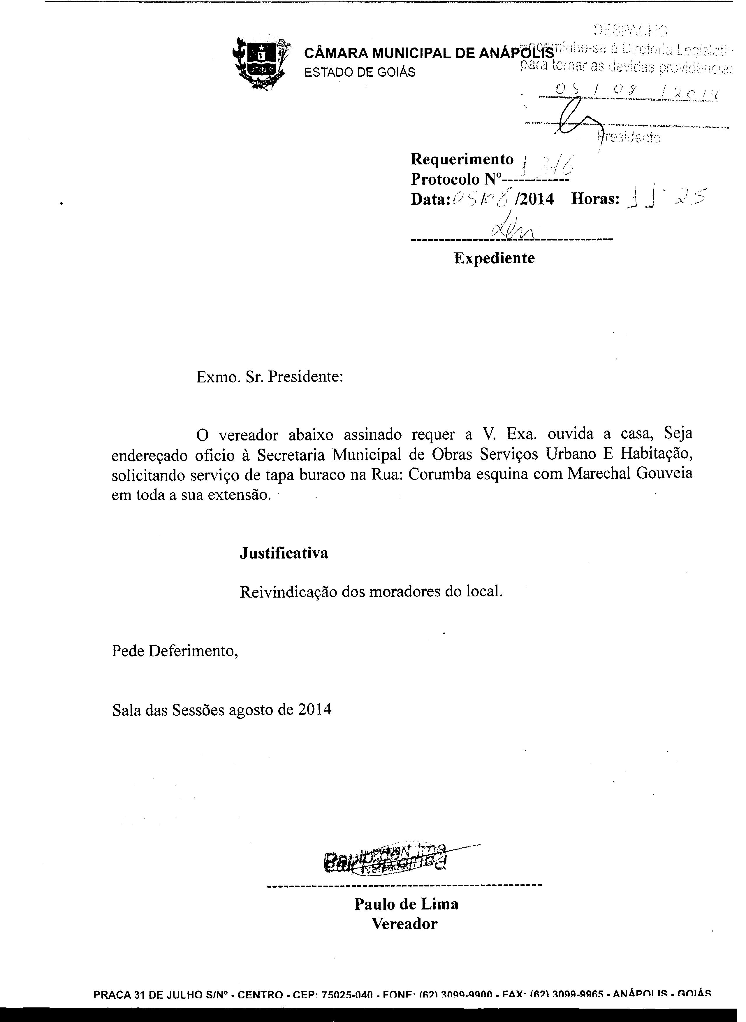 Ementa: SEJA ENDEREÇADO OFÍCIO Á SECRETARIA MUNICIPAL DE OBRAS, SERVIÇOS URBANOS E HABITAÇÃO, SOLICITANDO SERVIÇO DE TAPA BURACO NA RUA: CORUMBÁ ESQUINA COM MARECHAL GOUVEIA EM TODA A SUA EXTENSÃO.