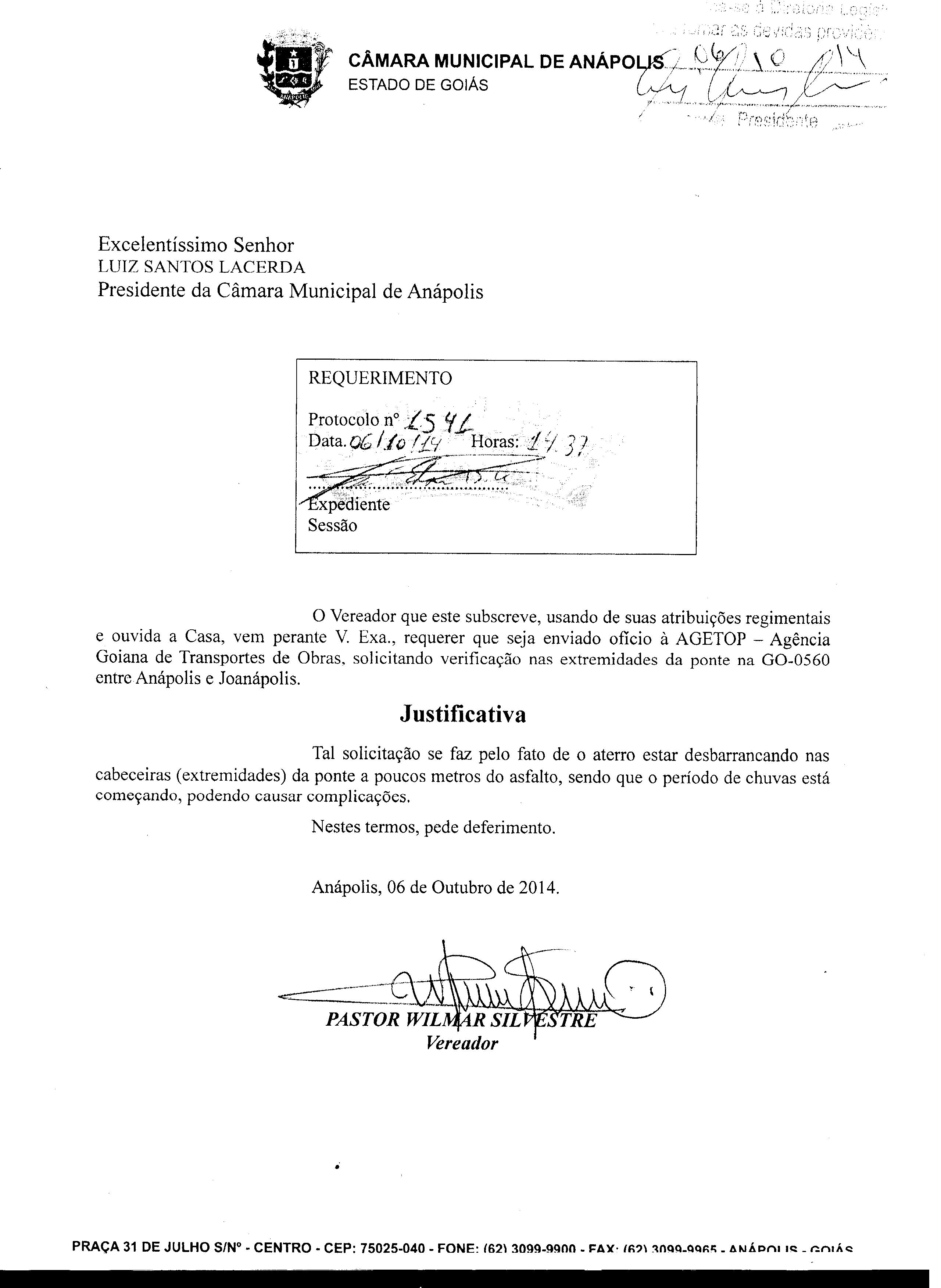 Ementa: À AGETOP-AGÊNCIA GOIANA DE TRANSPORTE DE OBRAS, SOLICITANDO VERIFICAÇÃO NAS EXTREMIDADES DA PONTE NA GO-0560 ENTRE ANÁPOLIS E JOANÁPOLIS.