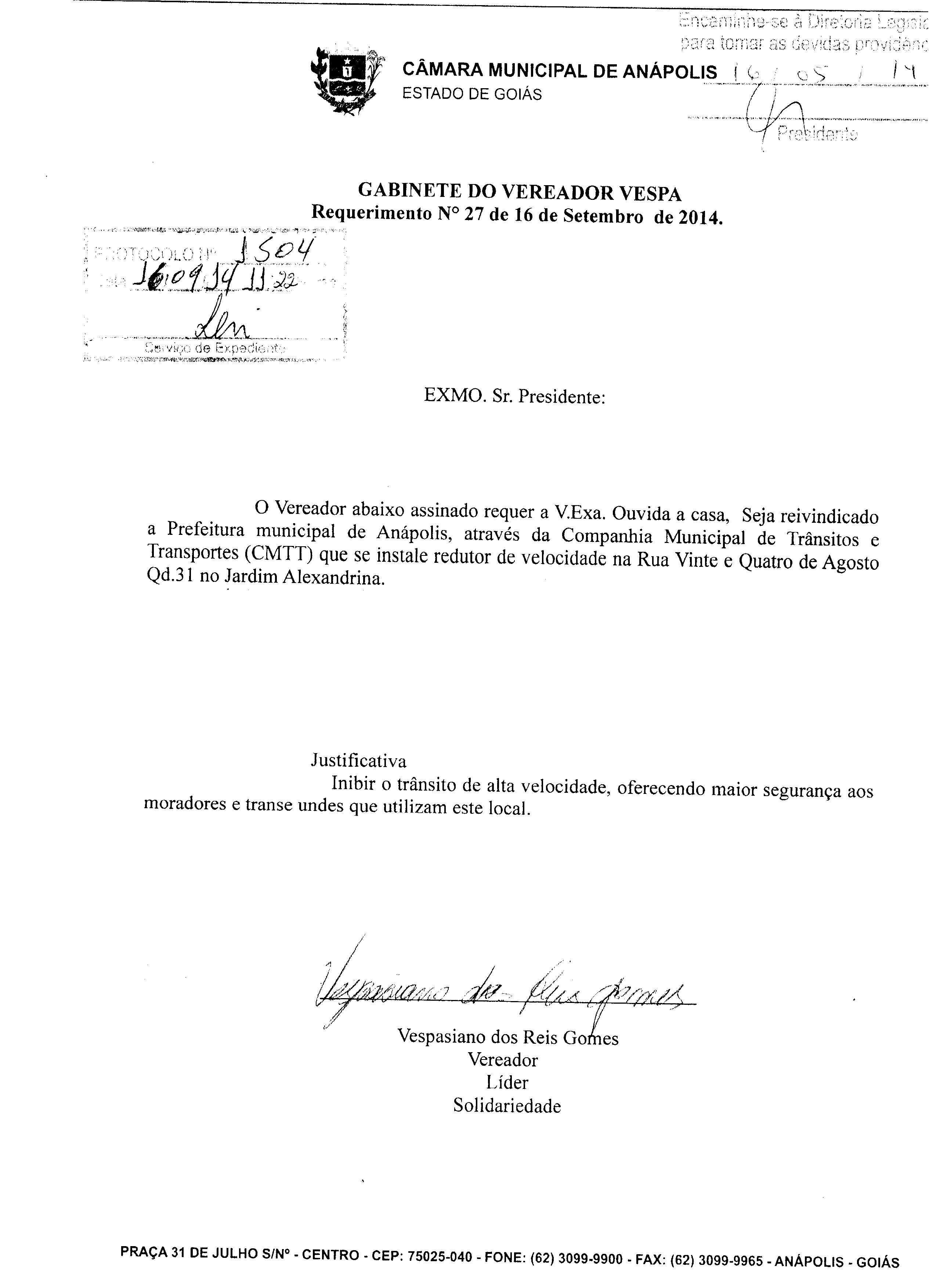 Ementa: SEJA REIVINDICADO A PREFEITURA MUNICIPAL DE ANÁPOLIS, ATRAVÉS DA COMPANHIA MUNICIPAL DE TRÂNSITO E TRANSPORTES (CMTT) QUE SE INSTALE REDUTOR DE VELOCIDADE NA RUA VINTE E QUATRO DE AGOSTO, QUADRA 31 NO JARDIM ALEXANDRINA.