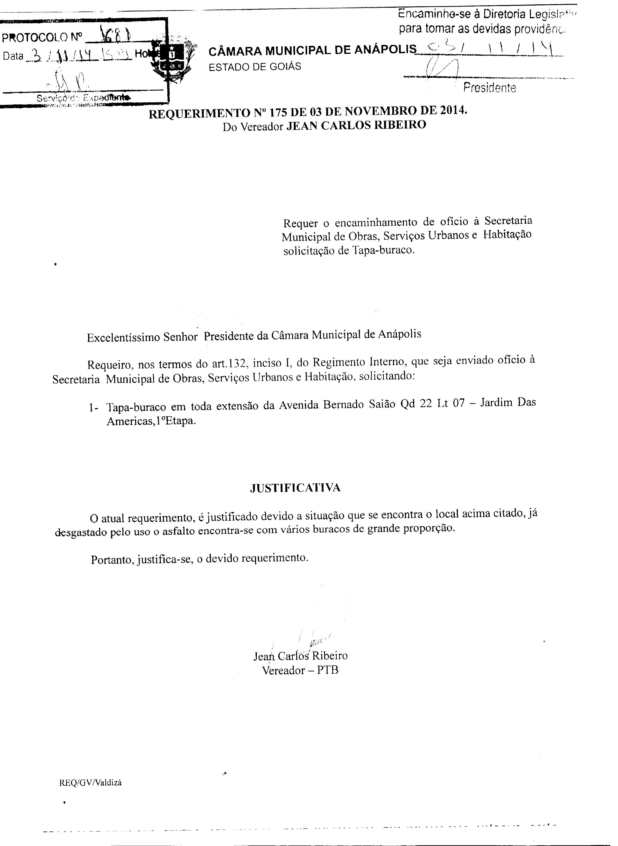 Ementa: QUE SEJA ENVIADO OFÍCIO À SECRETARIA MUNICIPAL DE OBRAS, SERVIÇOS URBANOS E HABITAÇÃO, SOLICITANDO: TAPA BURACO EM TODA A EXTENSÃO DA AVENIDA BERNARDO SAIÃO, QUADRA 22, LOTE 07, JARDIM DAS AMÉRICAS, 1ª ETAPA.