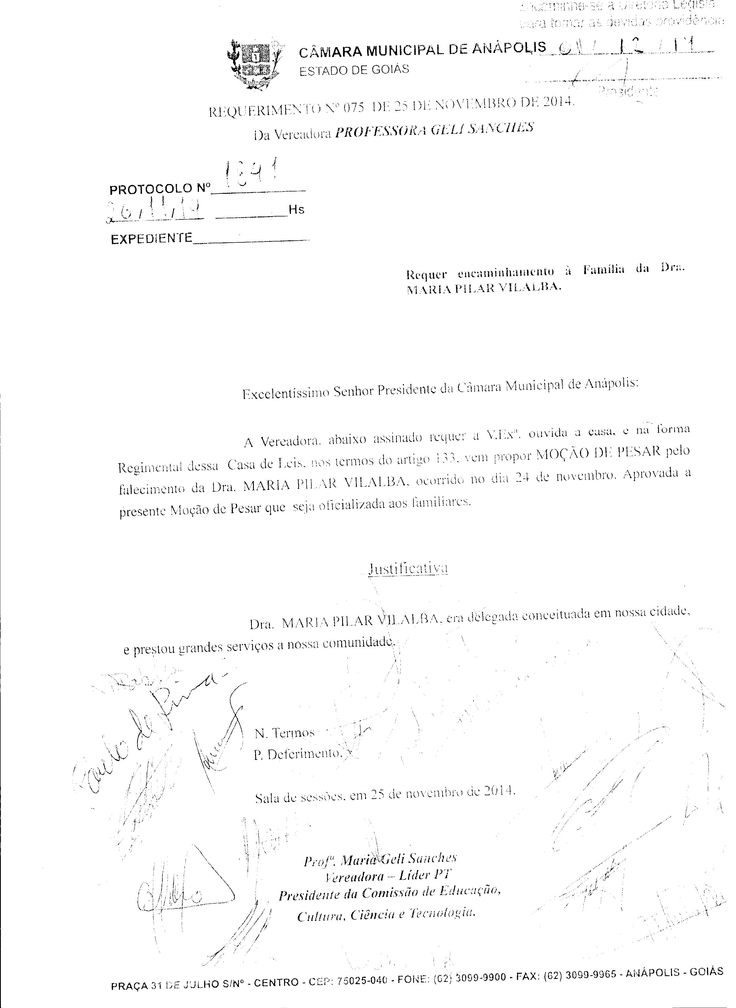 Ementa: A VEREADORA, ABAIXO ASSINADO REQUER A V. EXª. OUVIDA A CASA, E NA FORMA REGIMENTAL DESSA CASA DE LEIS, NOS TERMOS DO ARTIGO 133, VEM PROPOR MOÇÃO DE PESAR PELO FALECIMENTO DA DRA. MARIA PILAR VILALBA, OCORRIDO NO DIA 24 DE NOVEMBRO. APROVADA A PRESENTE MOÇÃO DE PESAR QUE SEJA OFICIALIZADA AOS FAMILIARES.