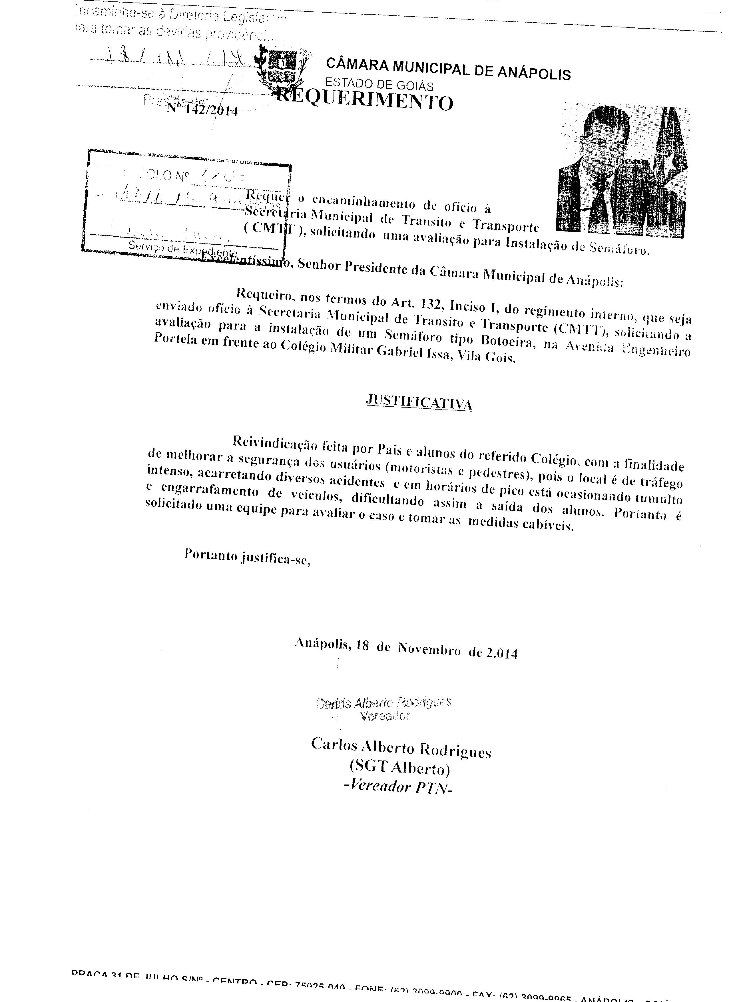 Ementa: QUE SEJA ENVIADO OFÍCIO À SECRETARIA MUNICIPAL DE TRÂNSITO E TRANSPORTE (CMTT), SOLICITANDO A AVALIAÇÃO PARA A INSTALAÇÃO DE UM SEMÁFORO TIPO BOTOEIRA, NA AVENIDA ENGENHEIRO PORTELA EM FRENTE AO COLÉGIO MILITAR GABRIEL ISSA, VILA GÓIS.