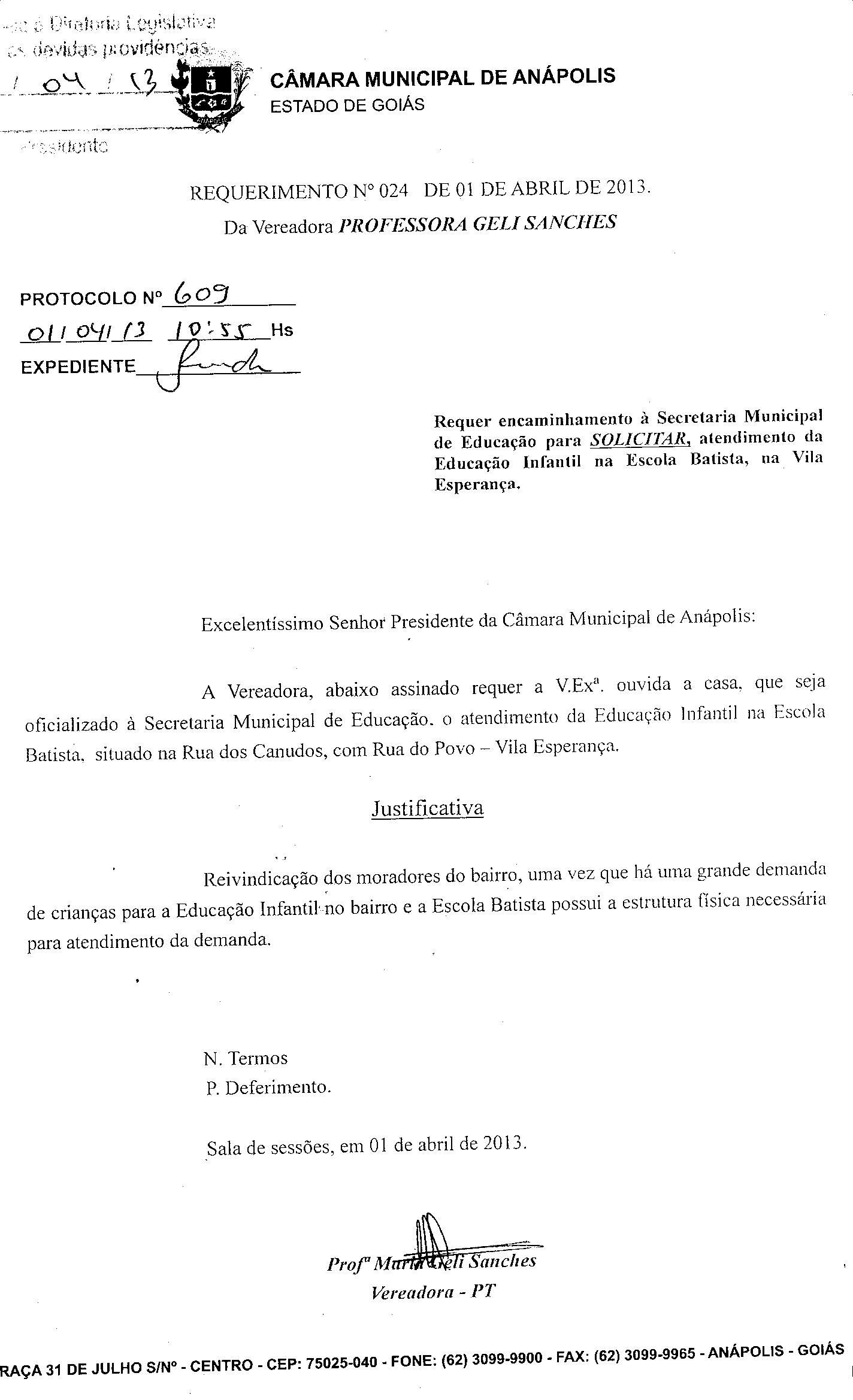 Ementa: À SECRETARIA MUNICIPAL DE EDUCAÇÃO, O ATENDIMENTO DA EDUCAÇÃO INFANTIL NA ESCOLA BATISTA, SITUADO NA RUA DOS CANUDOS, COM RUA DO POVO- VILA ESPERANÇA.