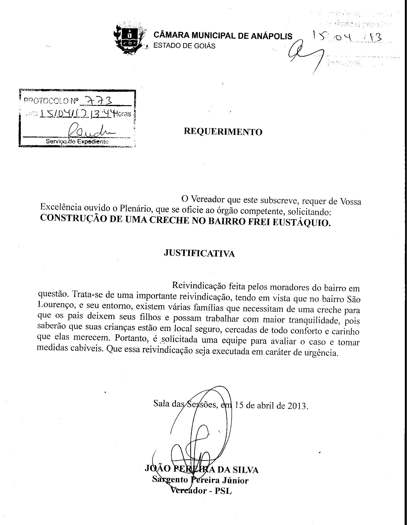 Ementa: QUE SE OFICIE AO ÓRGÃO COMPETENTE, SOLICITANDO: CONSTRUÇÃO DE UMA CRECHE NO BAIRRO FREI EUSTÁQUIO.