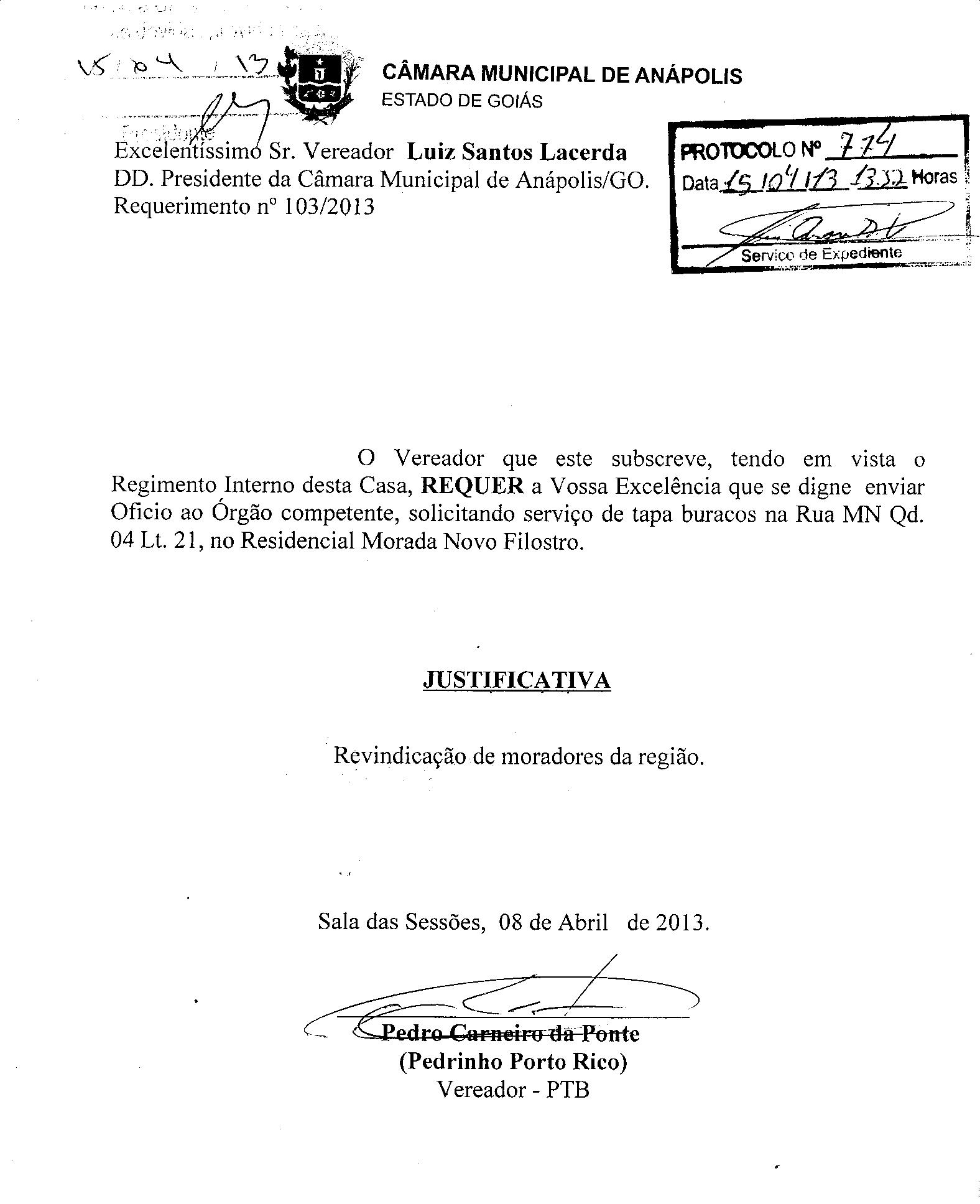 Ementa: À VOSSA EXCELÊNCIA QUE SE DIGNE ENVIAR OFÍCIO AO ÓRGÃO COMPETENTE, SOLICITANDO SERVIÇO DE TAPA BURACOS NA RUA MN QD. 04 LT. 21, NO RESIDENCIAL MORADA NOVO FILOSTRO.