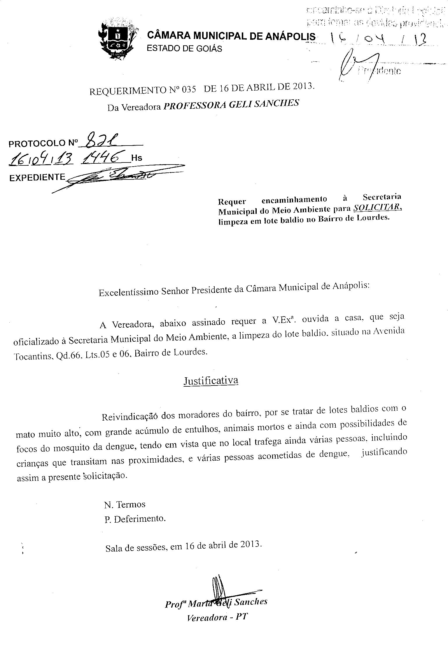 Ementa: À SECRETARIA MUNICIPAL DO MEIO AMBIENTE, A LIMPEZA DO LOTE BALDIO, SITUADO NA AVENIDA TOCANTINS, QD. 66, LTS. 66, LTS. 05 E 06, BAIRRO DE LOURDES.