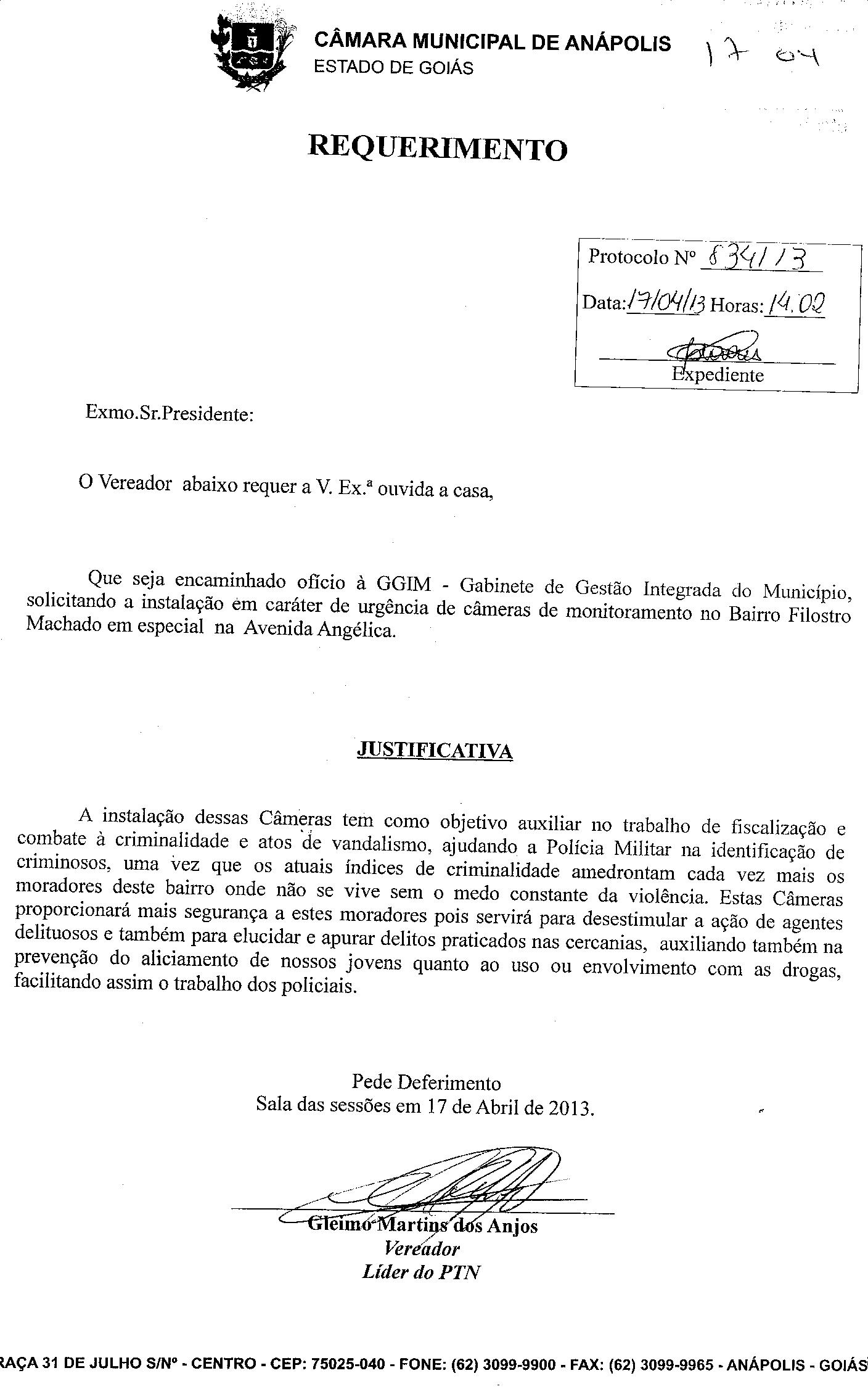 Ementa: À GGIM-GABINETE DE GESTÃO INTEGRADA DO MUNICÍPIO, SOLICITANDO A INSTALAÇÃO EM CARÁTER DE URGÊNCIA DE CÂMERAS DE MONITORAMENTO NO BAIRRO FILOSTRO MACHADO EM ESPECIAL NA AVENIDA ANGÉLICA.