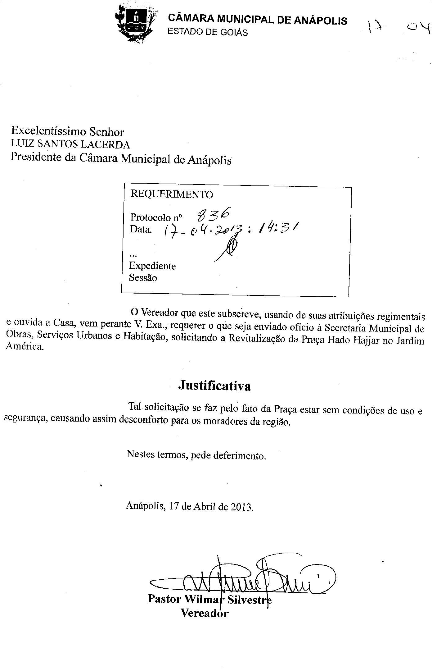 Ementa: À SECRETARIA MUNICIPAL DE OBRAS, SERVIÇOS URBANOS E HABITAÇÃO, SOLICITANDO A REVITALIZAÇÃO DA PRAÇA HADO HAJJAR NO JARDIM AMÉRICA.