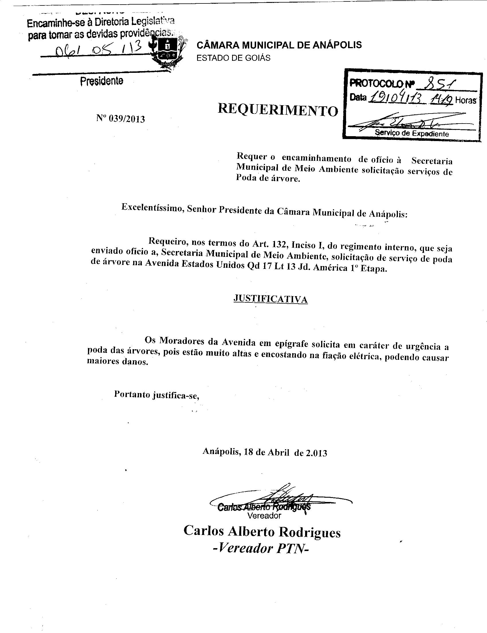 Ementa: REQUER O ENCAMINHAMENTO DE OFÍCIO A SANEAGO SOLICITANDO IMPLANTAÇÃO DE REDE DE ÁGUA TRATADA NA AV. RUA CARLOS ELIAS BAIRRO SÃO CARLOS.