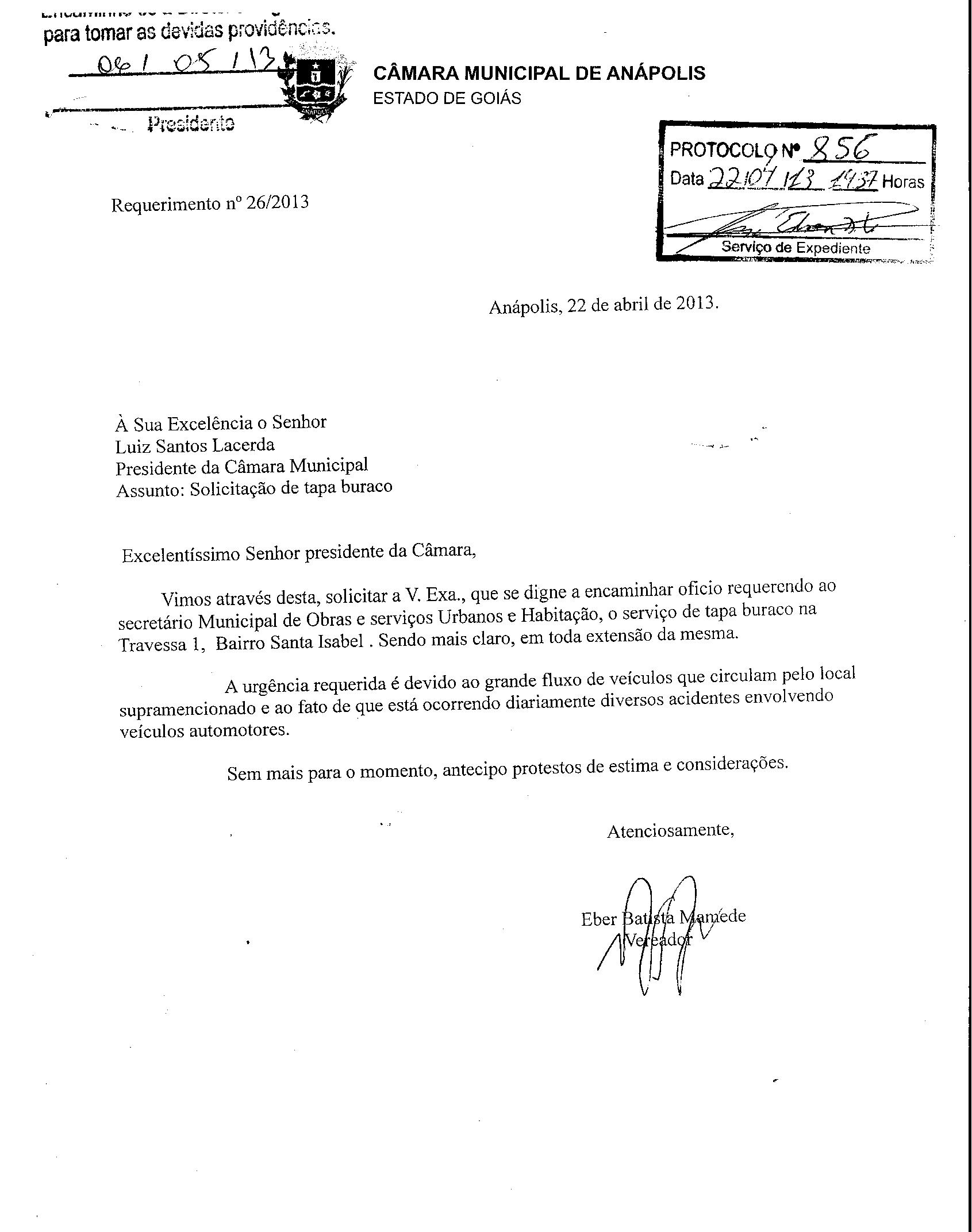 Ementa: REQUER ATRAVÉS DESTA, SOLICITAR A V. EXA. QUE SE DIGNE A ENCAMINHAR OFÍCIO REQUERENDO AO SECRETÁRIO MUNICIPAL DE OBRAS E SERVIÇOS URBANOS E HABITAÇÃO, O SERVIÇO DE TAPA BURACO NA RUA AVELAR, BAIRRO SANTA ISABEL.