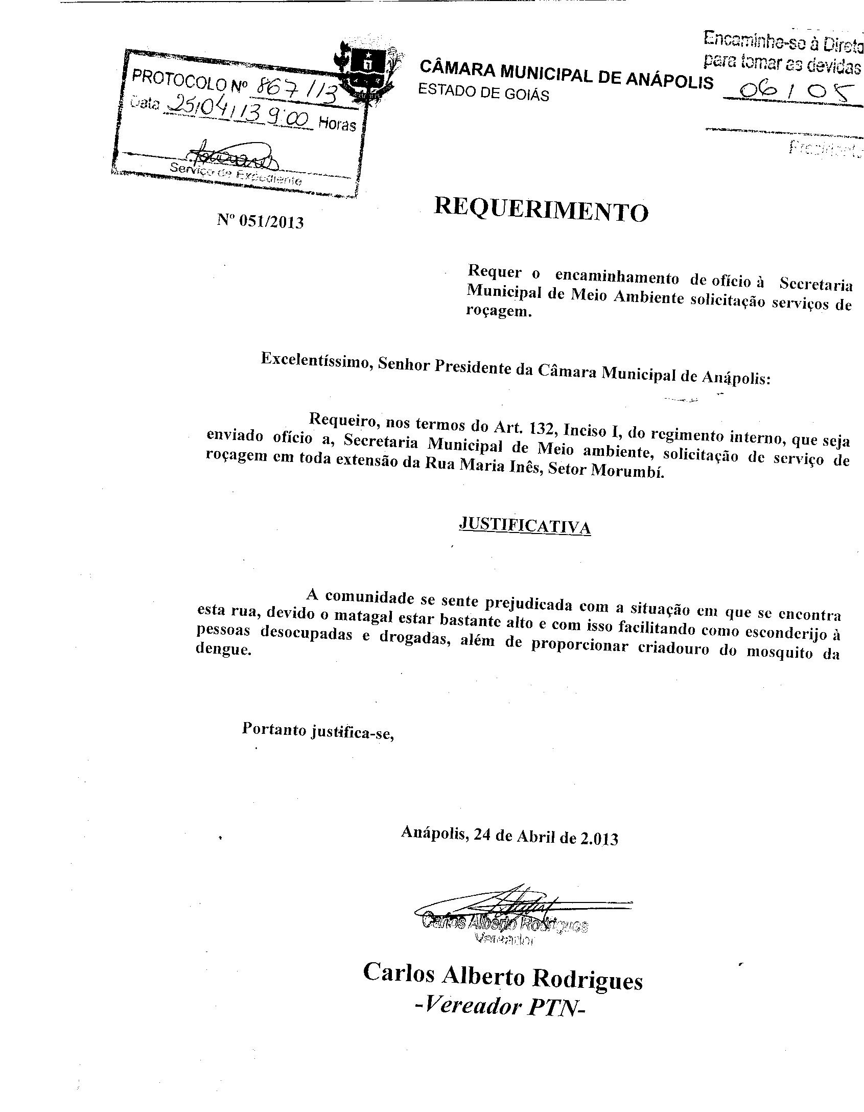 Ementa: À SECRETARIA MUNICIPAL DE MEIO AMBIENTE, SOLICITAÇÃO DE SERVIÇO DE ROÇAGEM EM TODA EXTENSÃO DA RUA MARIA INÊS, SETOR MORUMBÍ.