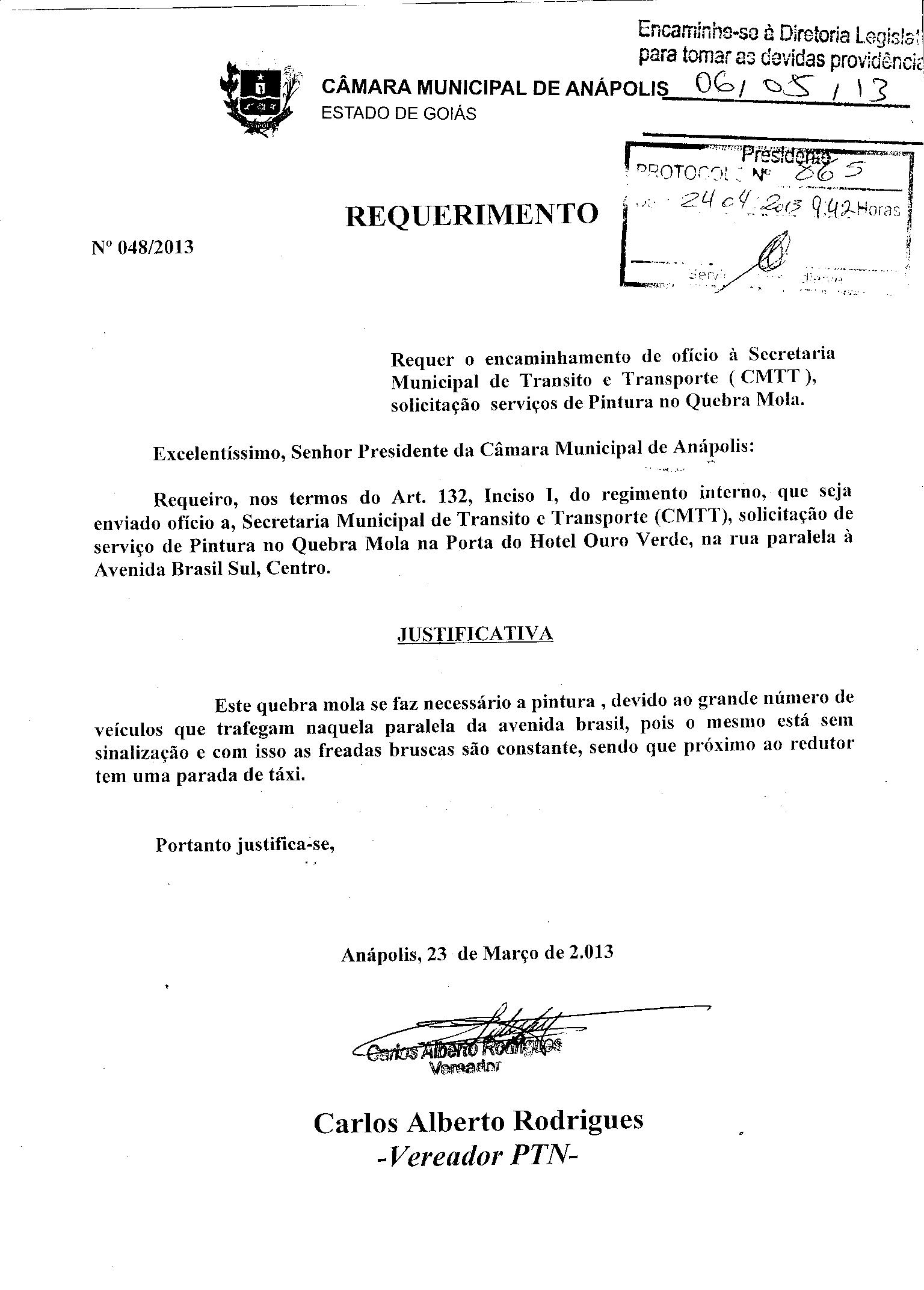 Ementa: REQUER O ENCAMINHAMENTO DE OFÍCIO À SECRETÁRIA MUNICIPAL DE TRANSITO DE TRANSITO E TRANSITO E TRANSPORTE (CMTT), SOLICITANDO SERVIÇOS DE PINTURAS NO QUEBRA MOLA. NA RUA PARALELA À AVENIDA BRASIL SUL. CENTRO