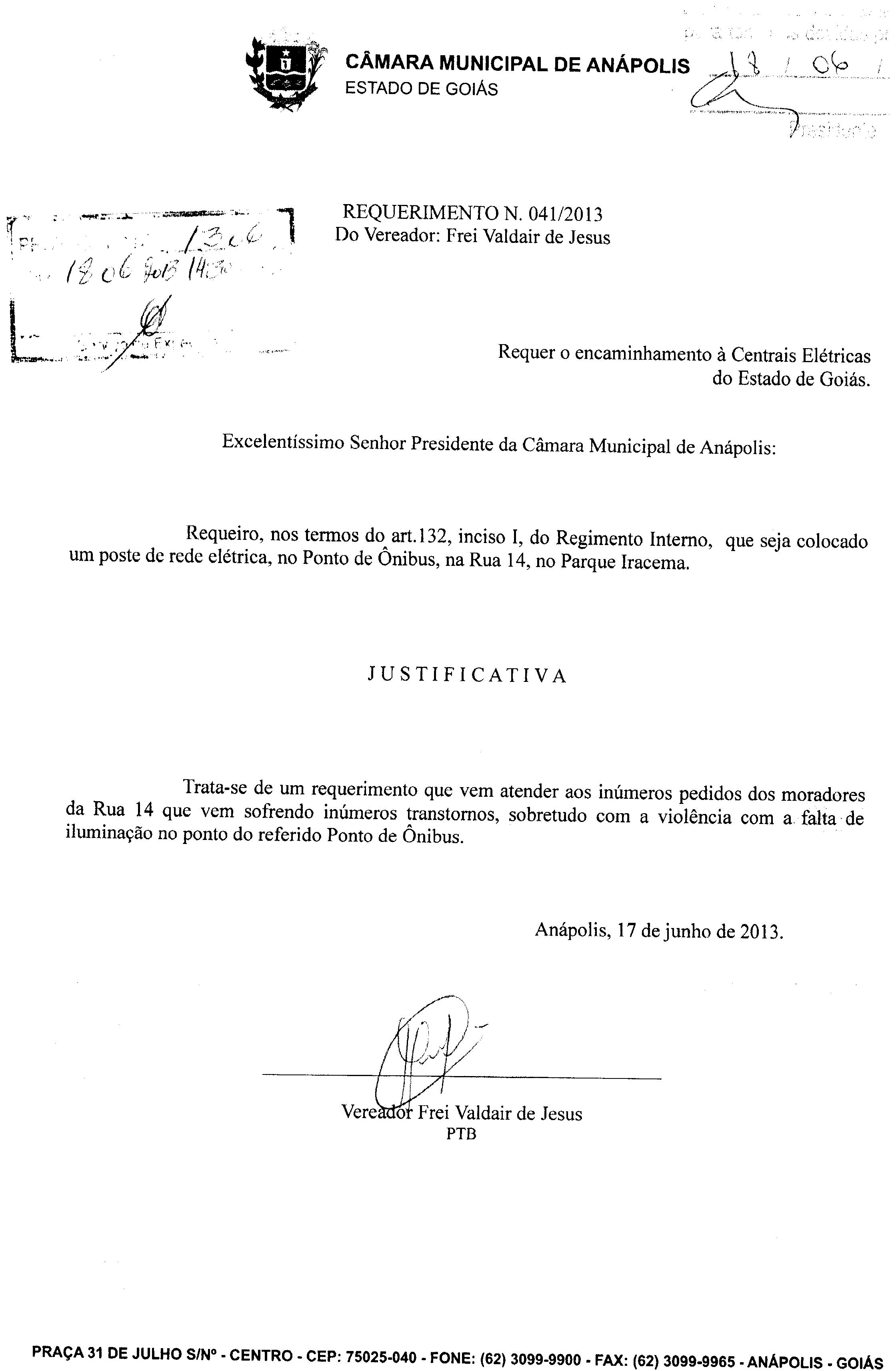Ementa: QUE SEJA COLOCADO UM POSTE DE REDE ELÉTRICA, NO PONTO DE ÔNIBUS, NA RUA 14, NO PARQUE IRACEMA.