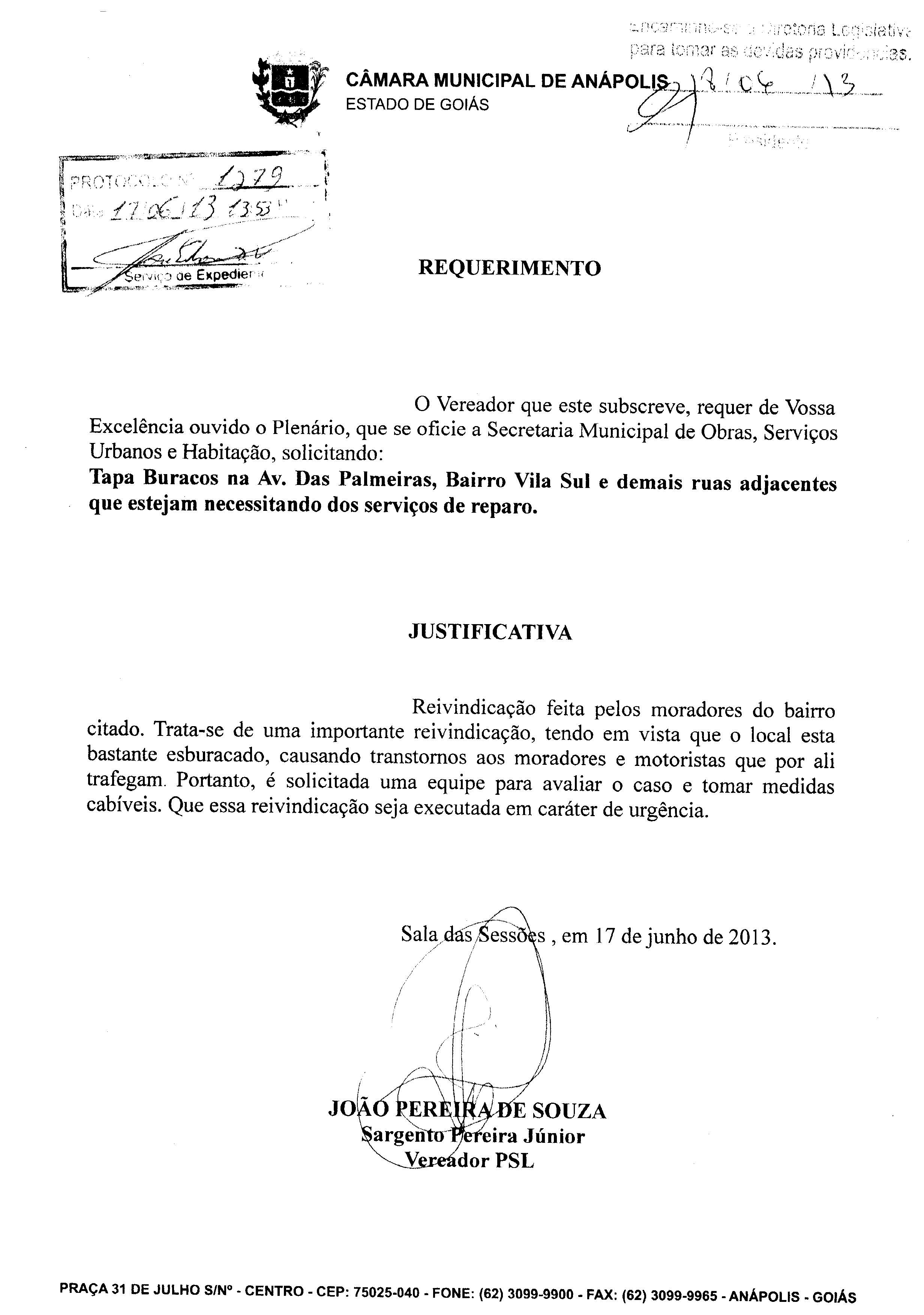 Ementa: À SECRETARIA MUNICIPAL DE OBRAS, SERVIÇO URBANOS E HABITAÇÃO, SOLICITANDO: TAPA BURACOS NA AV. DAS PALMEIRAS, BAIRRO VILA SUL E DEMAIS RUAS ADJACENTES QUE ESTEJAM NECESSITANDO DOS SERVIÇOS DE REPARO