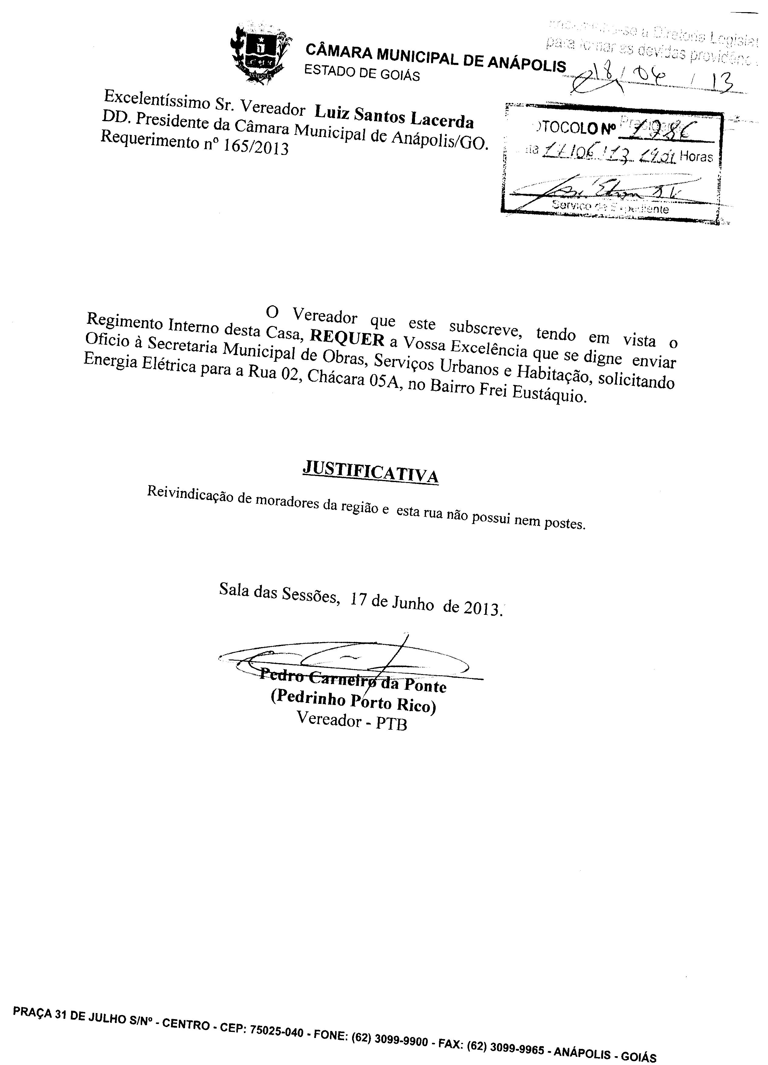 Ementa: À SECRETARIA MUNICIPAL DE OBRAS, SERVIÇOS URBANOS E HABITAÇÃO, SOLICITANDO ENERGIA ELÉTRICA PARA A RUA 02, CHÁCARA 05 A, NO BAIRRO FREI EUSTÁQUIO.