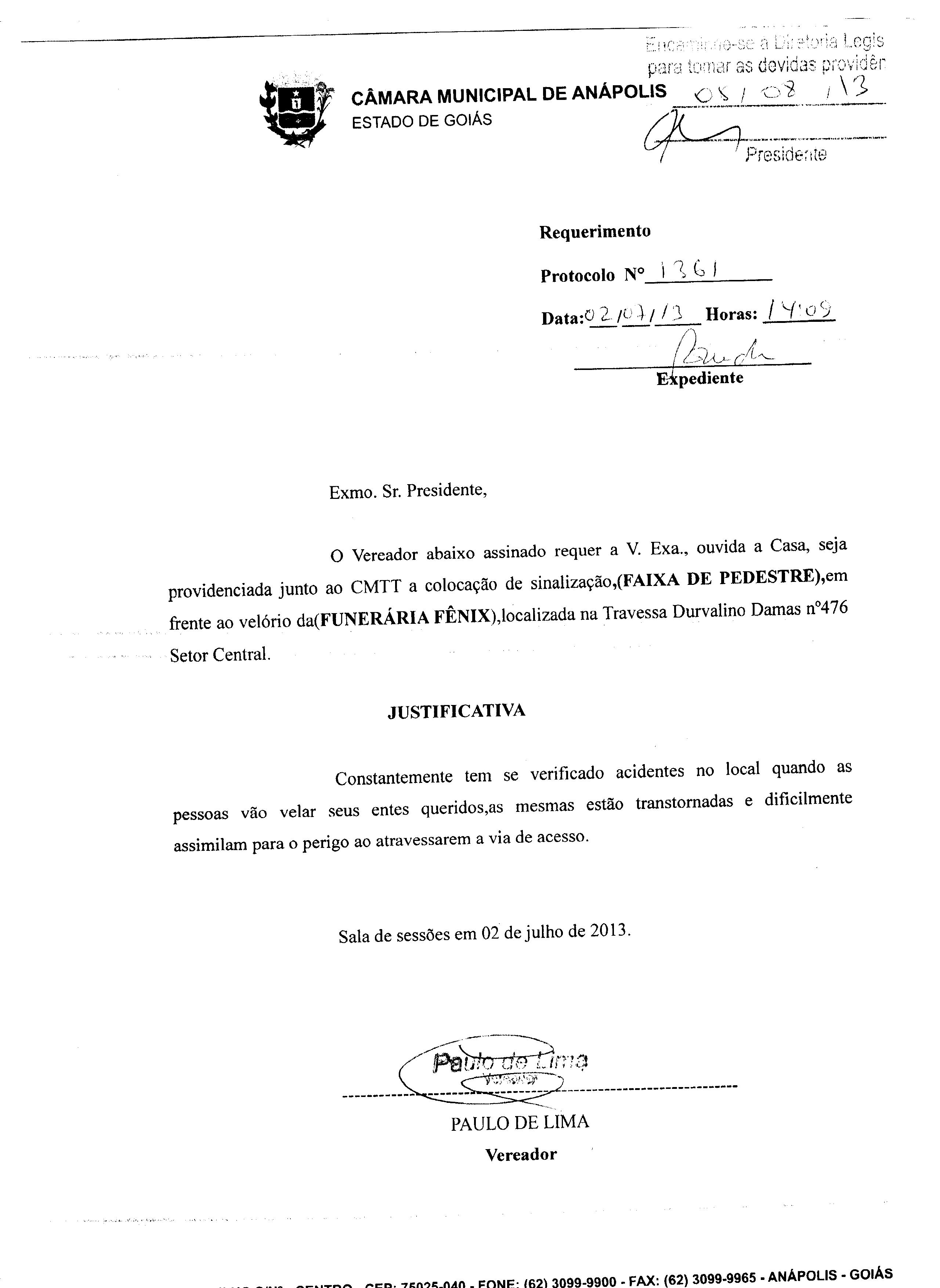 Ementa: À CMTT A COLOCAÇÃO DE SINALIZAÇÃO,(FAIXA DE PEDESTRE), EM FRENTE AO VELÓRIO DA (FUNERÁRIA FÊNIX), LOCALIZADA NA TRAVESSA DURVALINO DAMAS N° 476 SETOR CENTRAL.