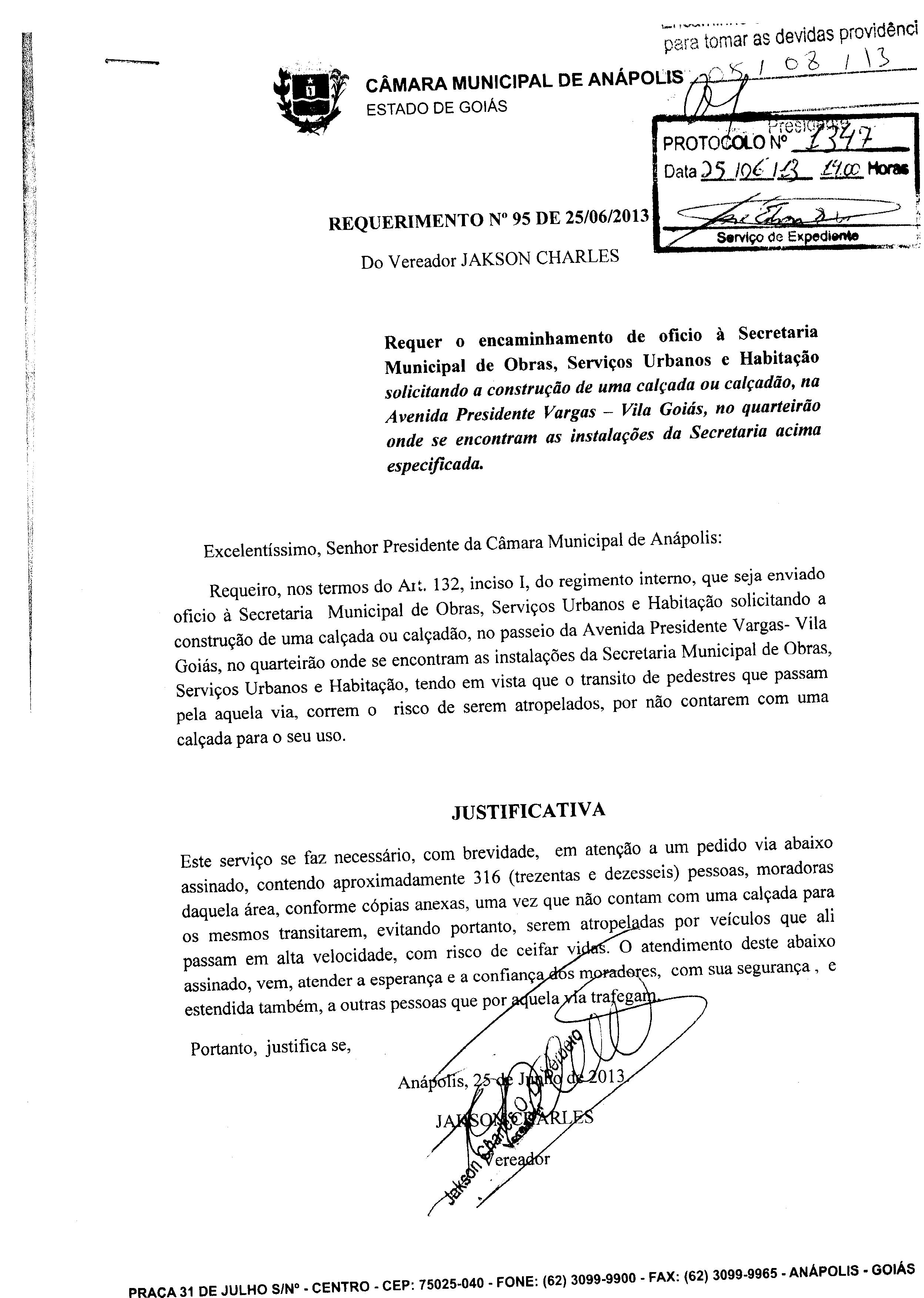 Ementa: À SECRETARIA MUNICIPAL DE OBRAS, SERVIÇOS URBANOS E HABITAÇÃO SOLICITANDO A CONSTRUÇÃO DE UMA CALÇADA OU CALÇADÃO, NO PASSEIO DA AVENIDA PRESIDENTE VARGAS- VILA GOIÁS, NO QUARTERÃOONDE SE ENCONTRAM AS INSTALAÇÃO DA SECRETARIA MUNICIPAL DE OBRAS, SERVIÇOS URBANOS E HABITAÇÃO, TENDO EM VISTA QUE O TRANSITO DE PEDESTRES QUE PASSAM PELA AQUELA VIA, CORREM O RISCO DE SEREM ATROPELADOS, POR NÃO CONTAREM COM UMA CALÇADA PARA O SEU USO.