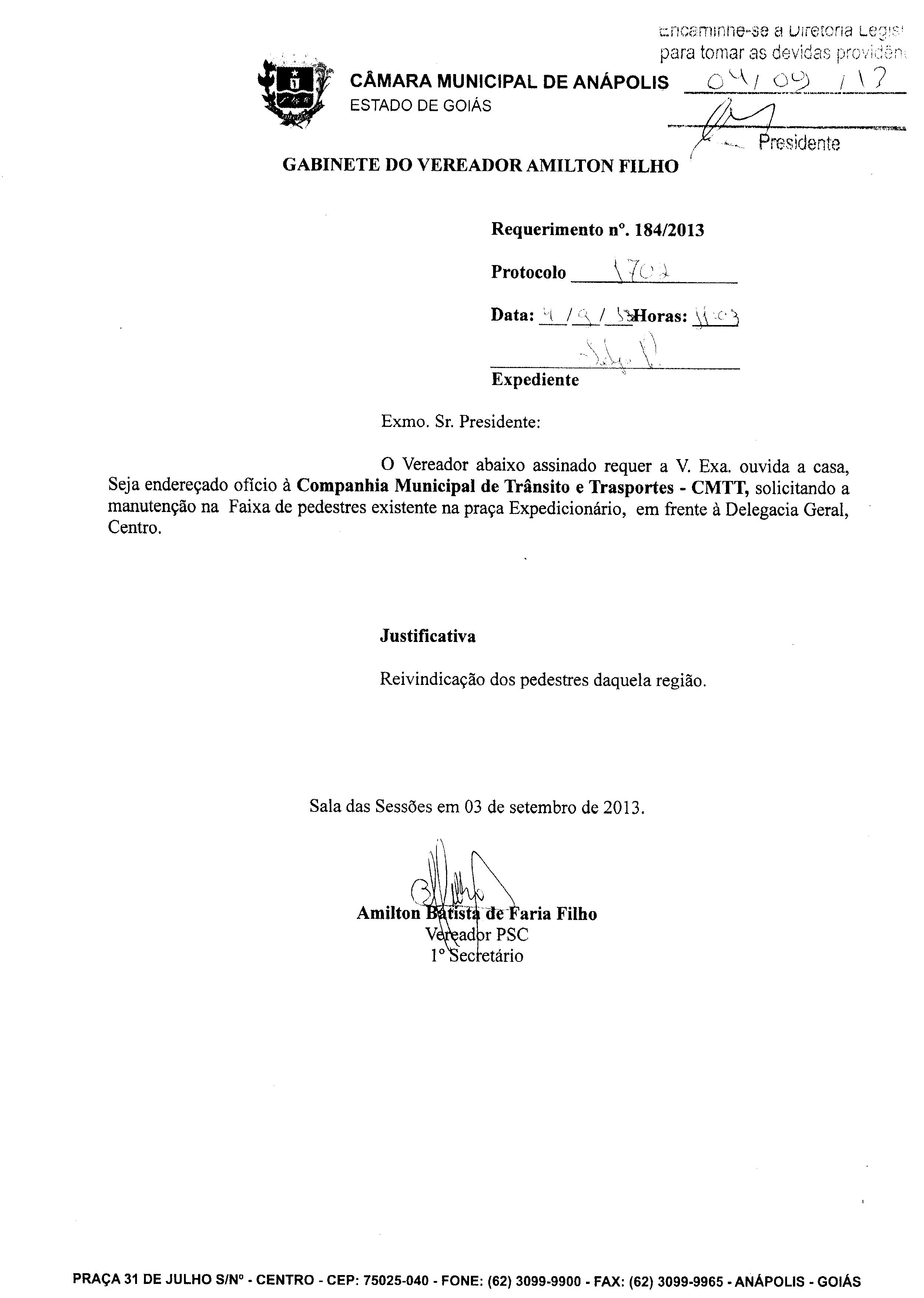 Ementa: À COMPANHIA MUNICIPAL DE TRÂNSITO E TRANSPORTE- CMTT, SOLICITANDO A MANUTENÇÃO NA FAIXA DE PEDESTRES EXISTENTENA PRAÇA ESPEDICIONÁRIO, EM FRENTE À DELEGACIA GERAL, CENTRO.
