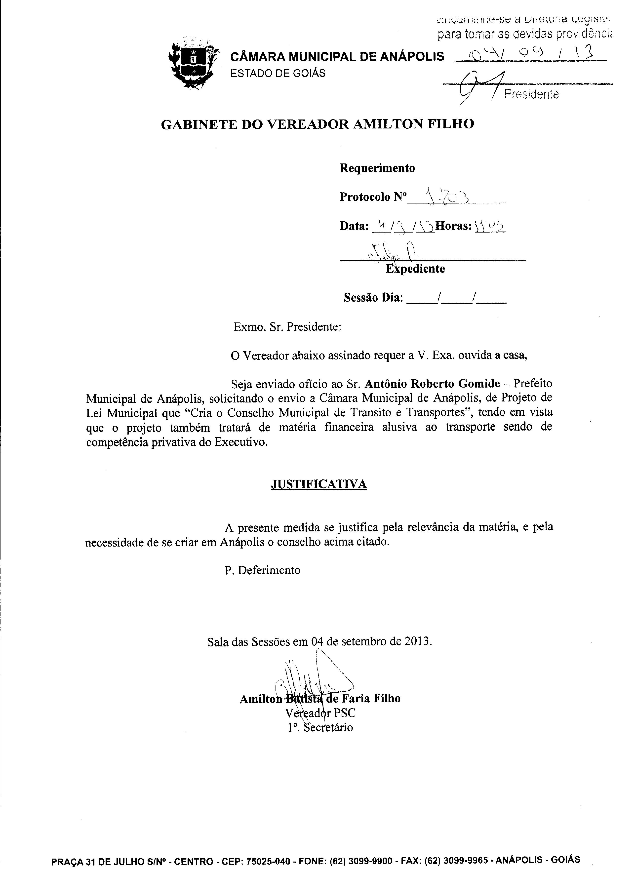 Ementa: SEJA ENVIADO AO SR. ANTÔNIO ROBERTO GOMIDE- PREFEITO MUNICIPAL DE ANÁPOLIS, SOLICITANDO O ENVIO A CÂMARA MUNICIPAL DE ANÁPOLIS, DE PROJETO DE LEI MUNICIPAL QUE "CRIA CONSELHO MUNICIPAL DE TRÂNSITO E TRANSPORTES", TENDO EM VISTA QUE O PROJETO TAMBÉM TRATARÁ DE MATÉRIA FINANCEIRA ALUSIVA AO TRANSPORTE SENDO DE COMPETÊNCIA PROVATIVA DO EXECUTIVO.