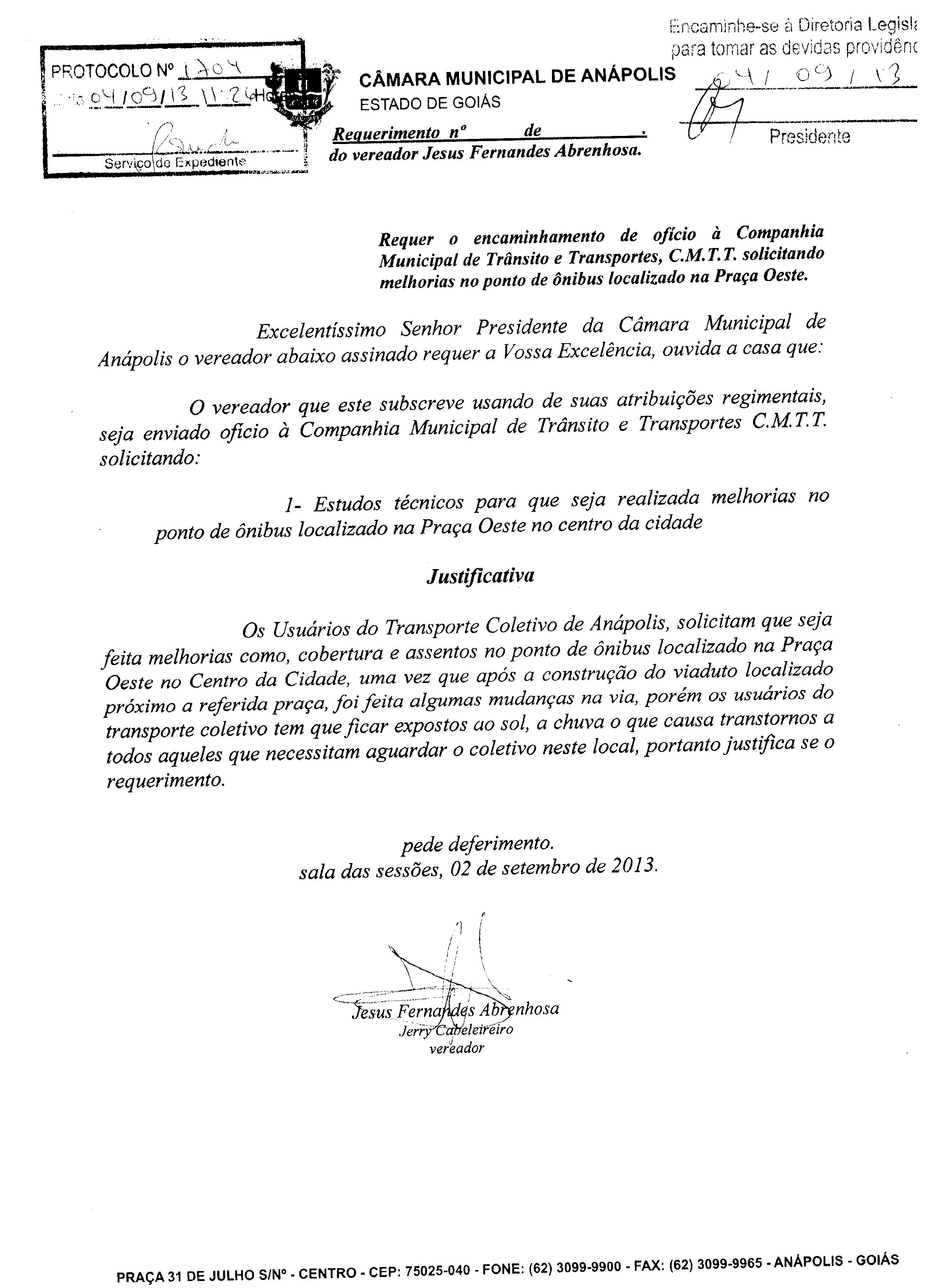 Ementa: À COMPANHIA MUNICIPAL DE TRÂNSITO E TRANSPORTES- CMTT, SOLICITANDO : ESTUDOS TÉCNICOS PARA QUE SEJA REALIZADA MELHORIAS NO PONTO DE ÔNIBUS LOCALIZADO NA PRAÇA OESTE NO CENTRO DA CIDADE.