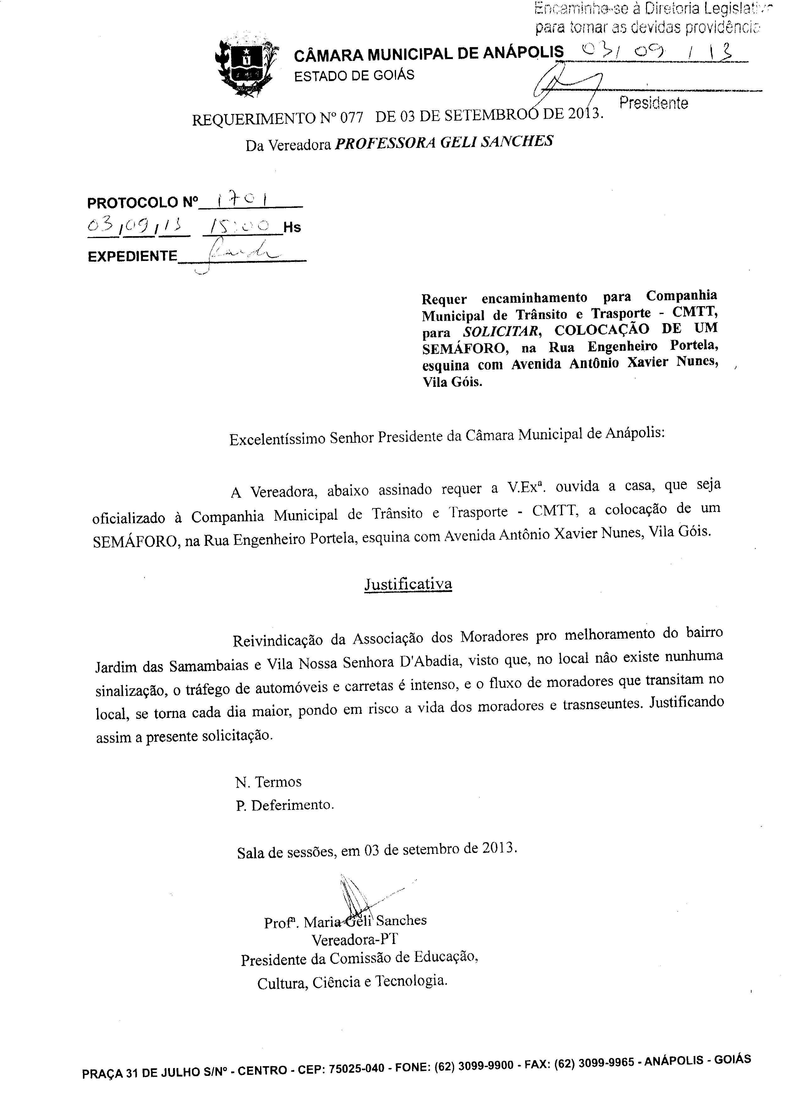 Ementa: À COMPANHIA MUNICIPAL DE TRÂNSITO E TRANSPORTE- CMTT, A COLOCAÇÃO DE UM SEMÁFORO, NA RUA ENGENHEIRO PORTELA, ESQUINA COM AVENIDA ANTÔNIO XAVIER NUNES, VILA GÓIS.