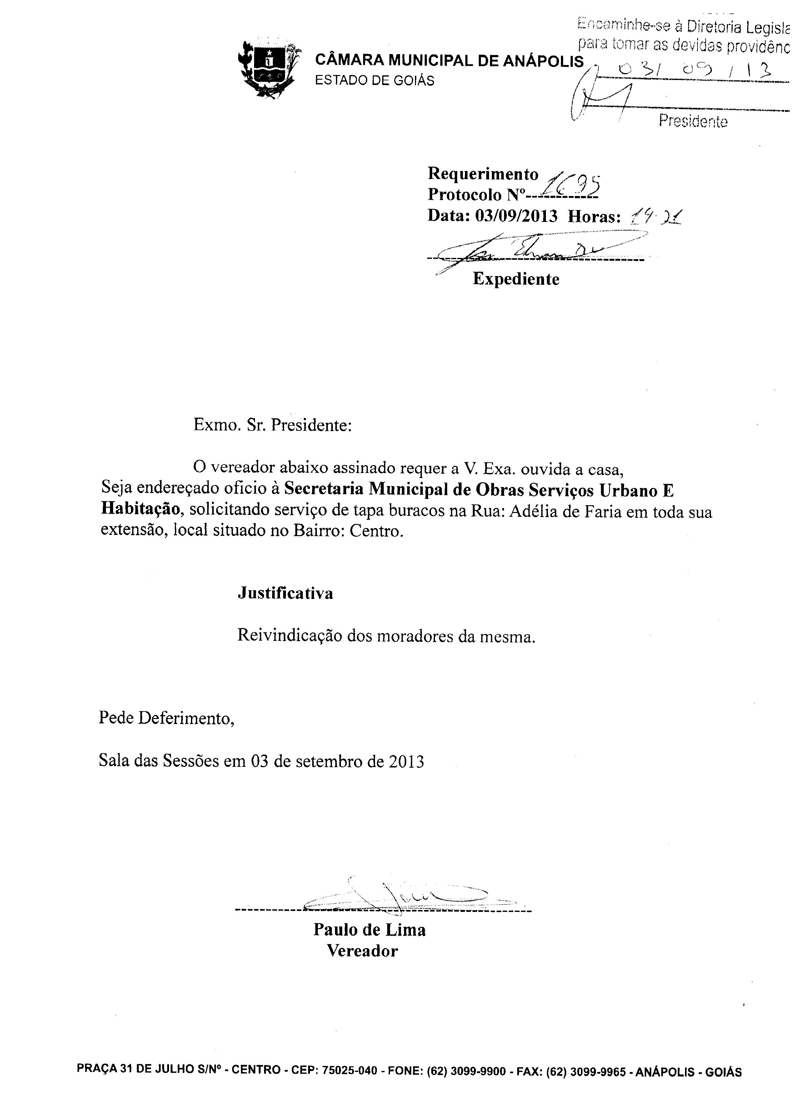 Ementa: À SECRETARIA MUNICIPAL DE OBRAS SERVIÇOS URBANOS E HABITAÇÃO, SOLICITANDO SERVIÇO DE TAPA BURACOS NA RUA: ADÉLIA DE FARIA EM TODA SUA EXTENSÃO, LOCAL SITUADO NO BAIRRO: CENTRO.