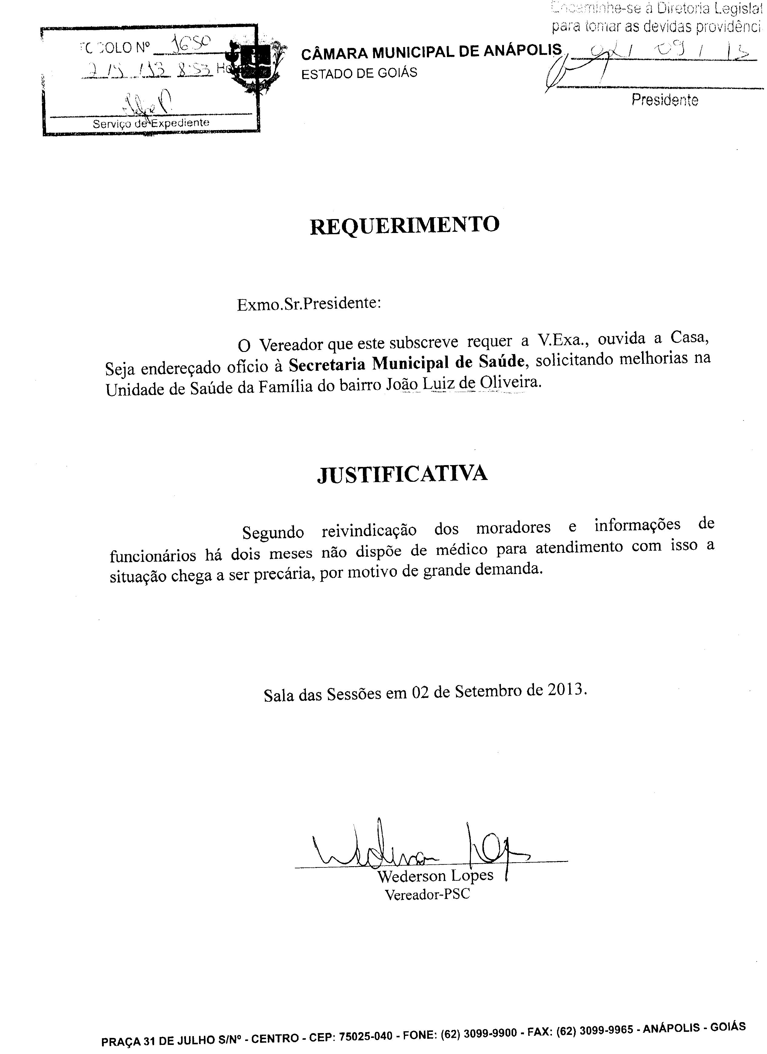 Ementa: À SECRETÁRIA MUNICIPAL DE SAÚDE, SOLICITANDO MELHORIAS NA UNIDADE DE SAÚDE DA FAMÍLIA DO BAIRRO JOÃO LUIZ DE OLIVIERA.
