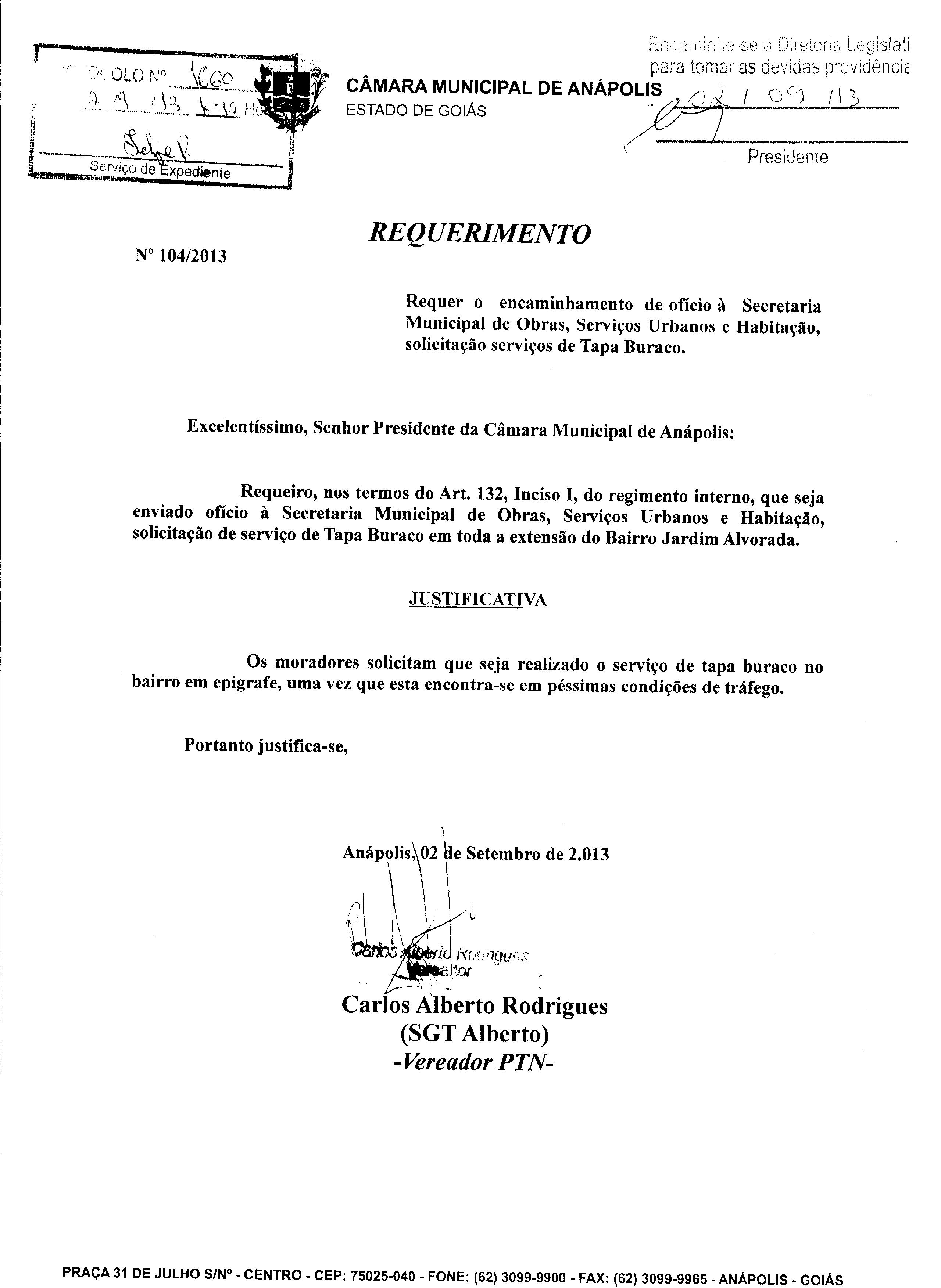Ementa: À SECRETARIA MUNICIPAL DE OBRAS, SERVIÇOS URBANOS E HABITAÇÃO, SOLICITAÇÃO DE SERVIÇO DE TAPA BURACO EM TODA A EXTENSÃO DO BAIRRO JARDIM ALVORADA.