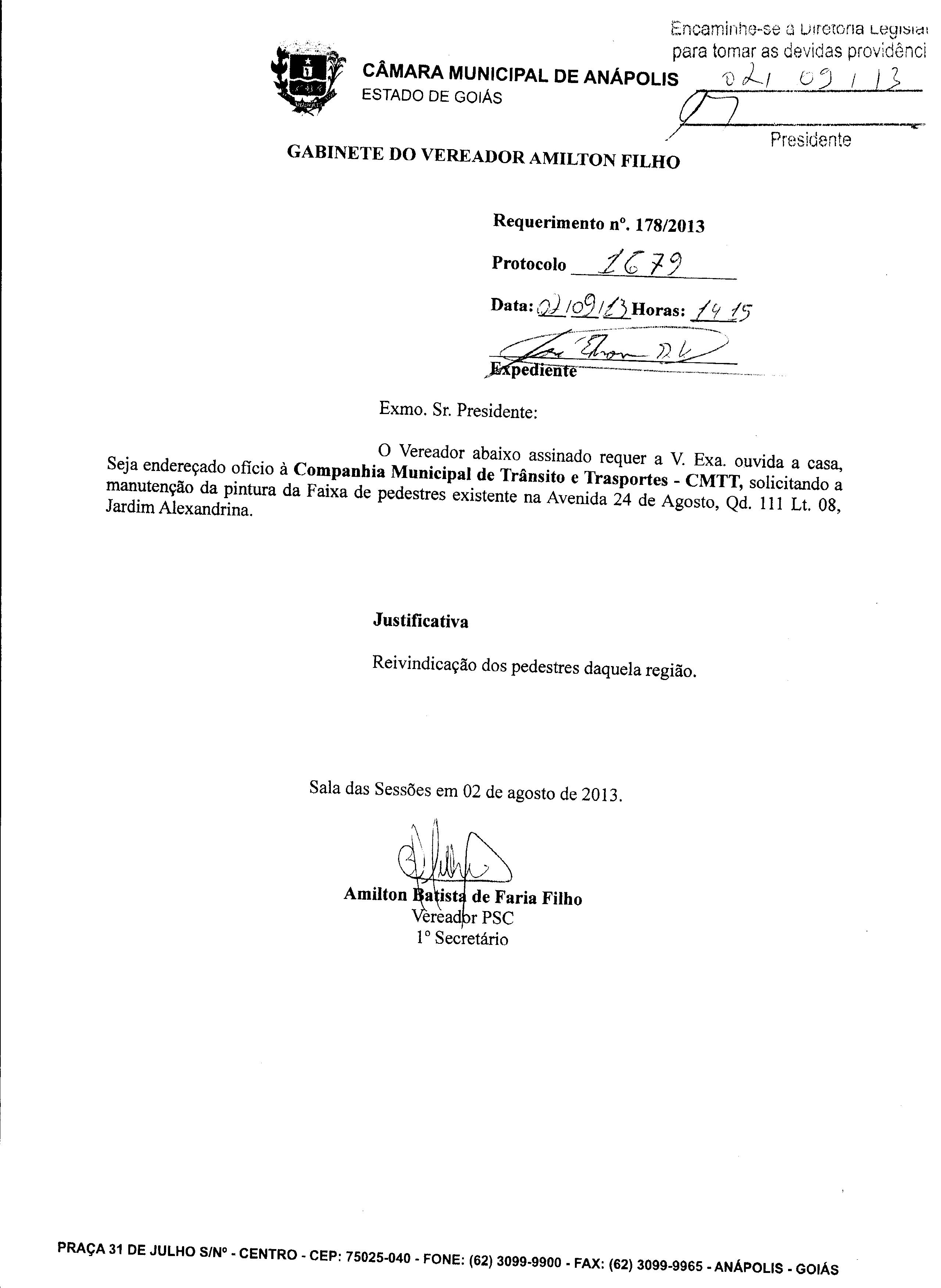 Ementa: À COMPANHIA MUNICIPAL DE TRÂNSITO E TRANSPORTES- CMTT, SOLICITANDO A MANUTENÇÃO DA PINTURA DA FAIXA DE PEDESTRES EXISTENTES NA AVENIDA 24 DE AGOSTO, QD. 111 LT. 08, JARDIM ALEXANDRINA.