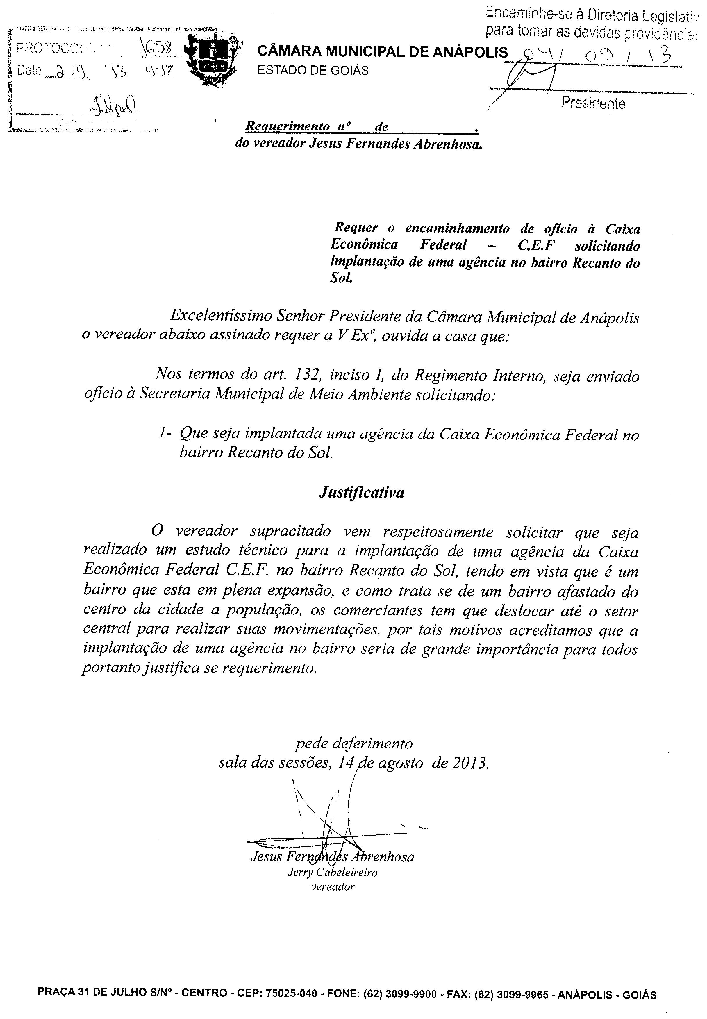 Ementa: À SECRETARIA MUNICIPAL DE MEIO AMBIENTE SOLICITANDO: QUE SEJA IMPLANTADA UMA AGÊNCIA DA CAIXA ECONÔMICA FEDERAL NO BAIRRO RECANTO DO SOL.