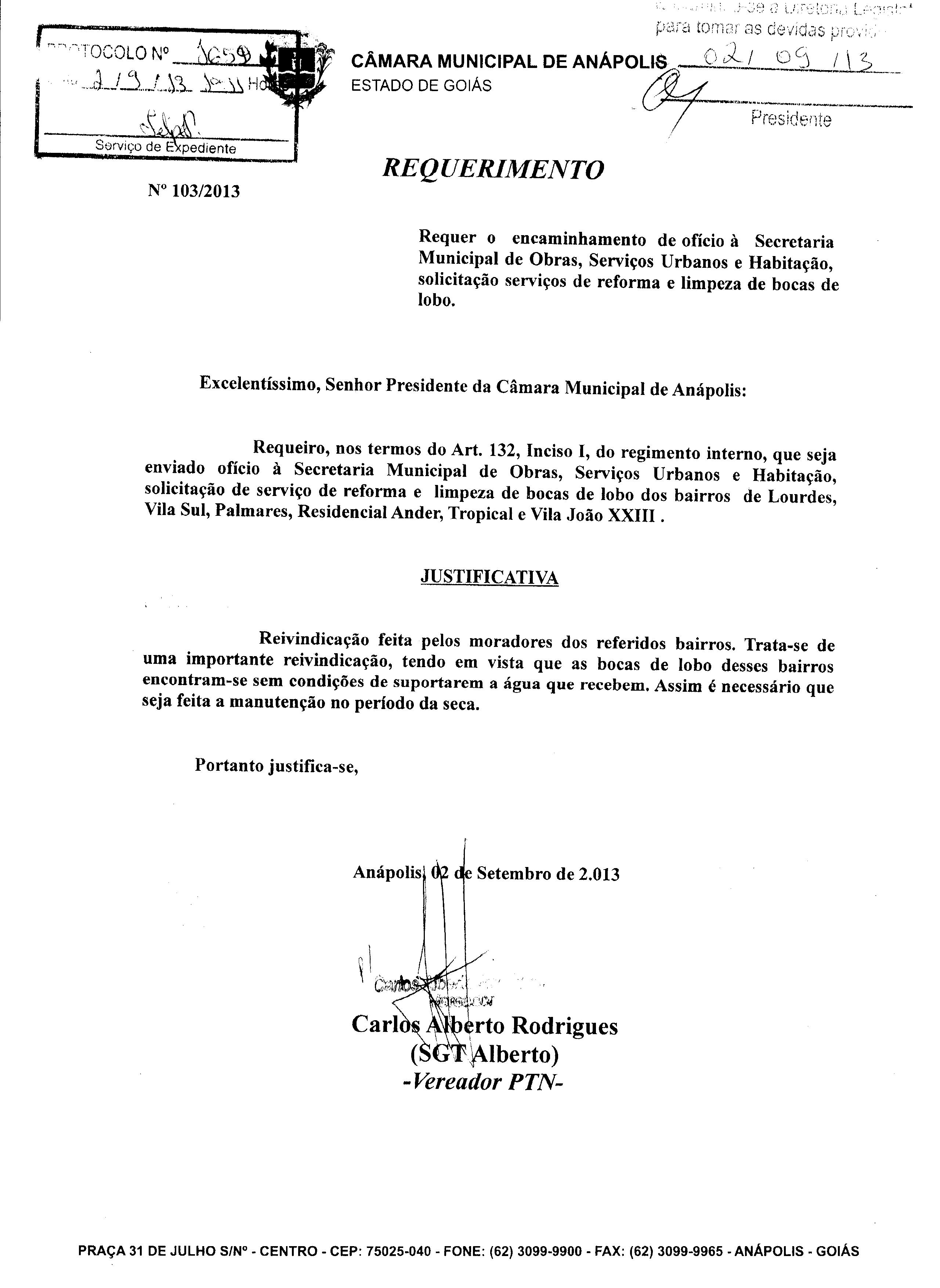 Ementa: À SECRETARIA MUNICIPAL DE OBRAS, SERVIÇOS URBANOS E HABITAÇÃO, SOLICITAÇÃO DE SERVIÇO DE REFORMA E LIMPEZA DE BOCAS DE LOBO DOS BAIRROS DE LOURDES, VILA SUL, PALMARES, RESIDENCIAL ANDER, TROPICAL E VILA JOÃO XXIII.