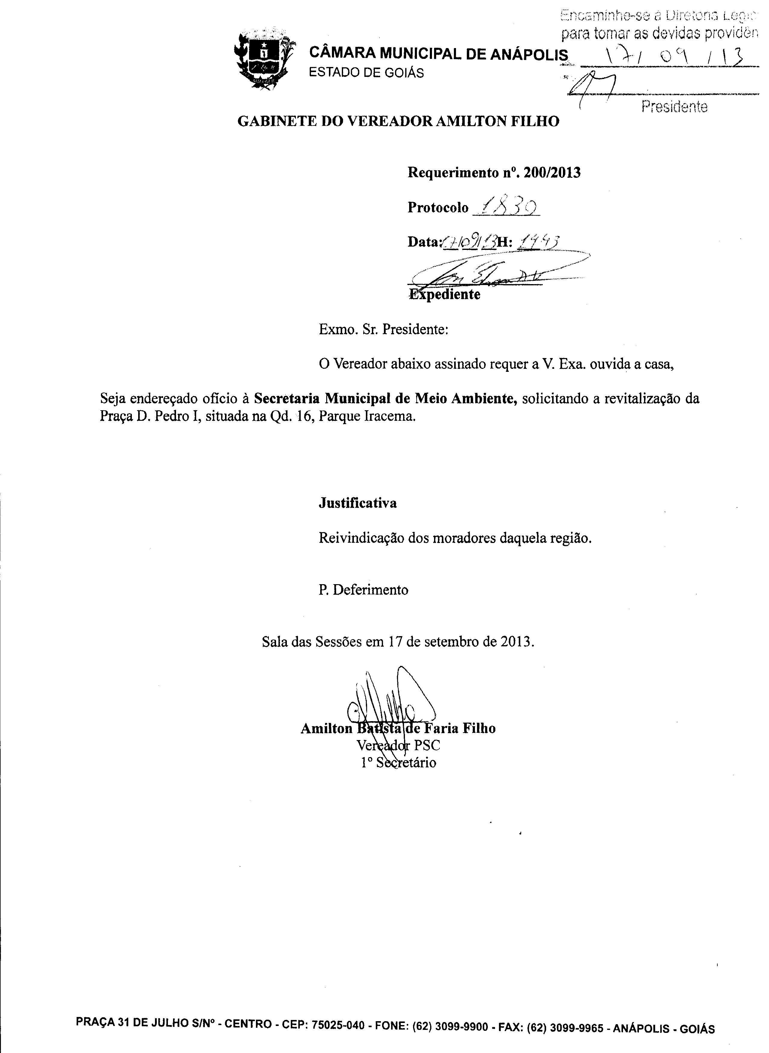 Ementa: À SECRETARIA MUNICIPAL DE MEIO AMBIENTE, SOLICITANDO A REVITALIZAÇÃO DA PRAÇA D. PEDRO I, SITUADA NA QD.16, PARQUE IRACEMA.