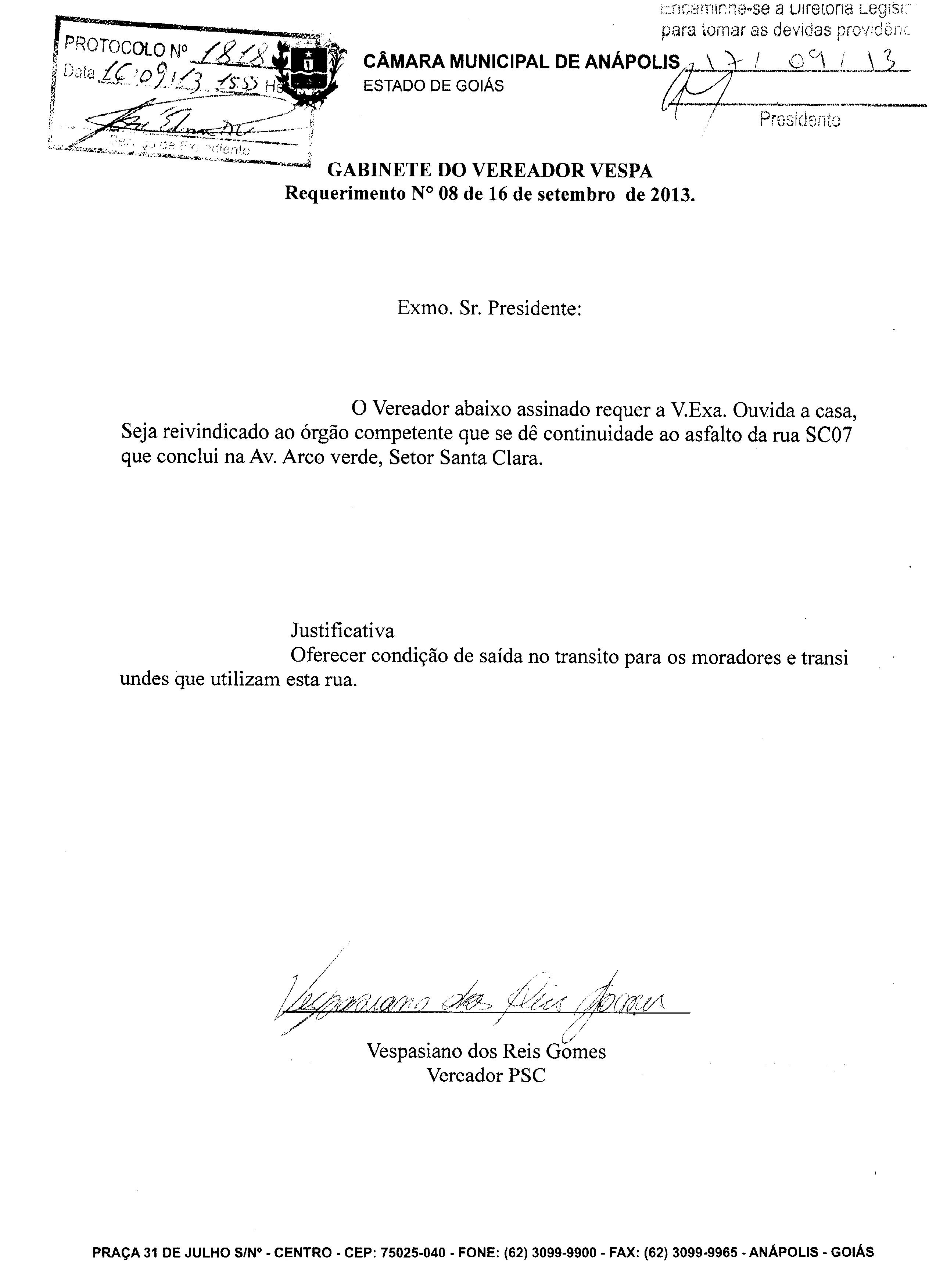 Ementa: AO ÓRGÃO COMPETENTE QUE SE DÊ CONTINUIDADE AO ASFALTO DA RUA SC07 QUE CONCLUI NA AV. ARCO VERDE, SETOR SANTA CLARA.