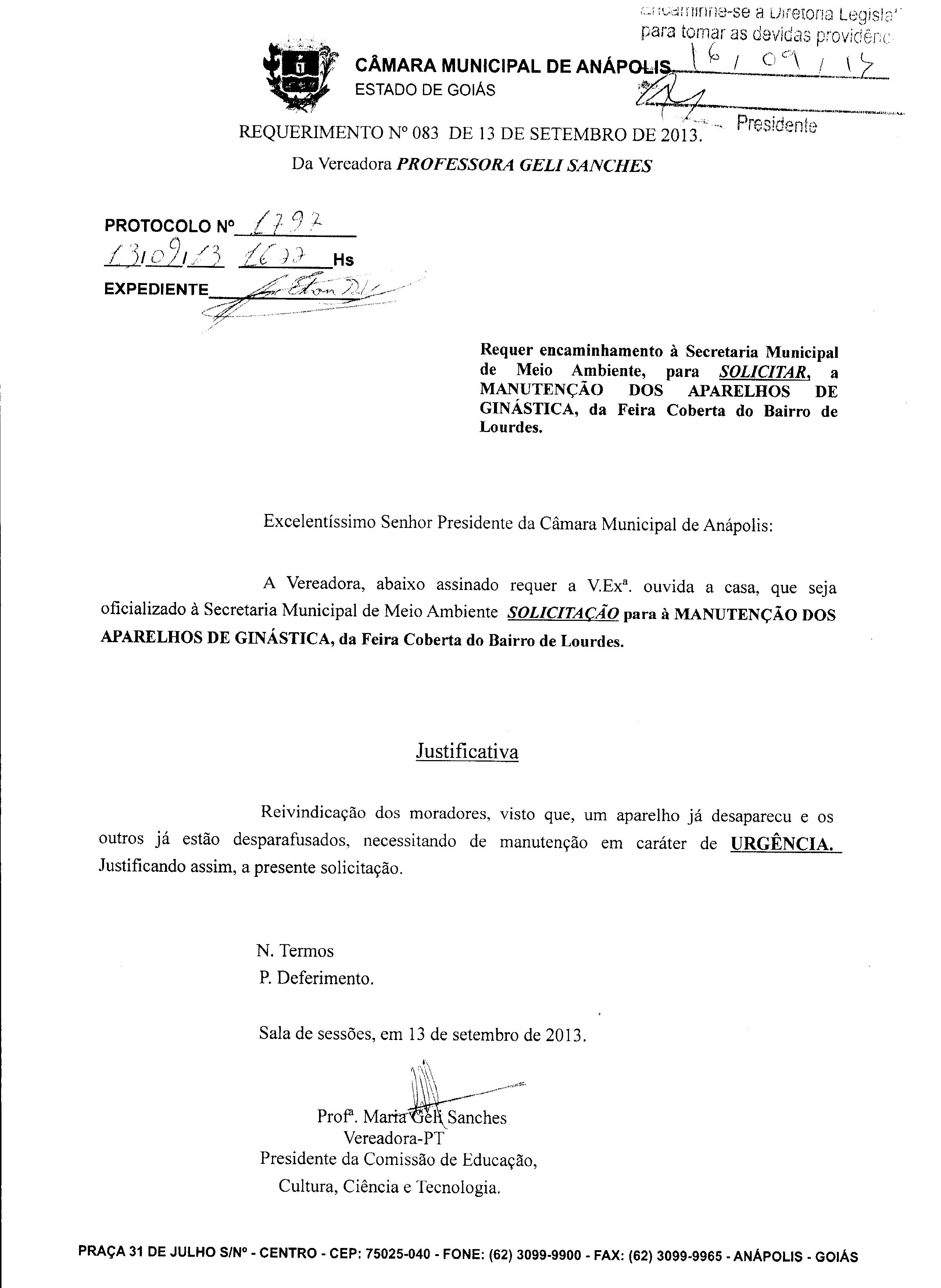 Ementa: À SECRETARIA MUNICIPAL DE MEIO AMBIENTE SOLICITAÇÃO PARA À MANUNTENÇÃO DOS APARELHOS DE GINÁSTICA, DA FEIRA COBERTA DO BAIRRO DE LOURDES.