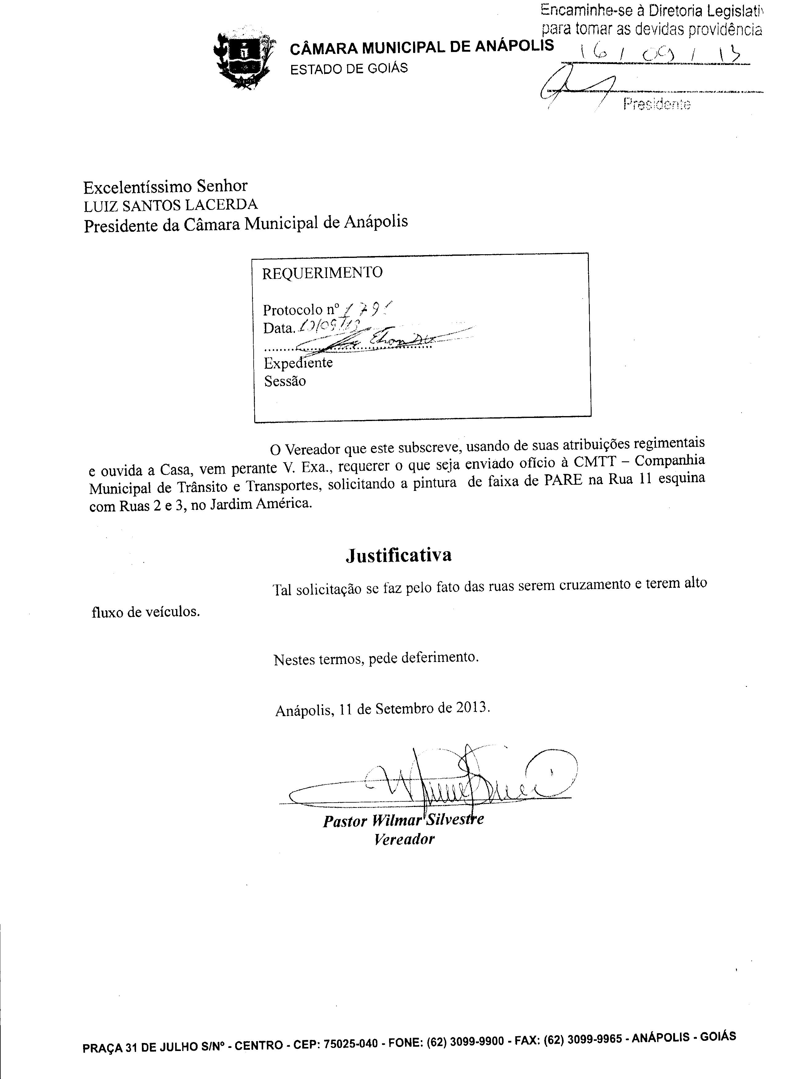 Ementa: À COMPANHIA MUNICIPAL DE TRÂNSITO E TRANSPORTE, SOLICITANDO A PINTURA DE FAIXA DE PARE NA RUA 11 ESQUINA COM RUA 2 E 3, NO JARDIM AMÉRICA.