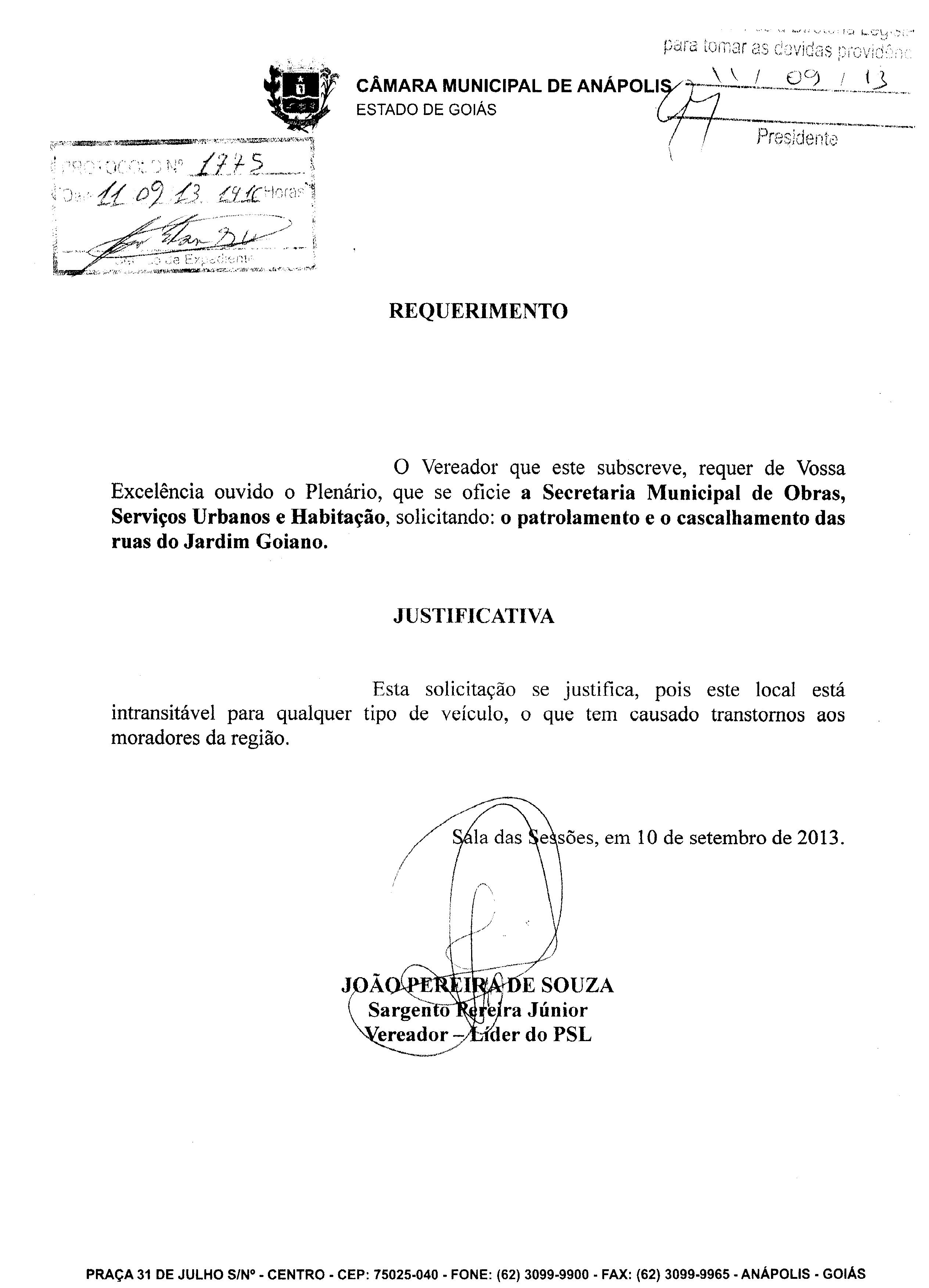 Ementa: À SECRETARIA MUNICIPAL DE OBRAS, SERVIÇOS URBANOS E HABITAÇÃO, SOLICITANDO: O PATROLAMENTO E O CASCALHAMENTO DAS RUAS DO JARDIM GOIANO.