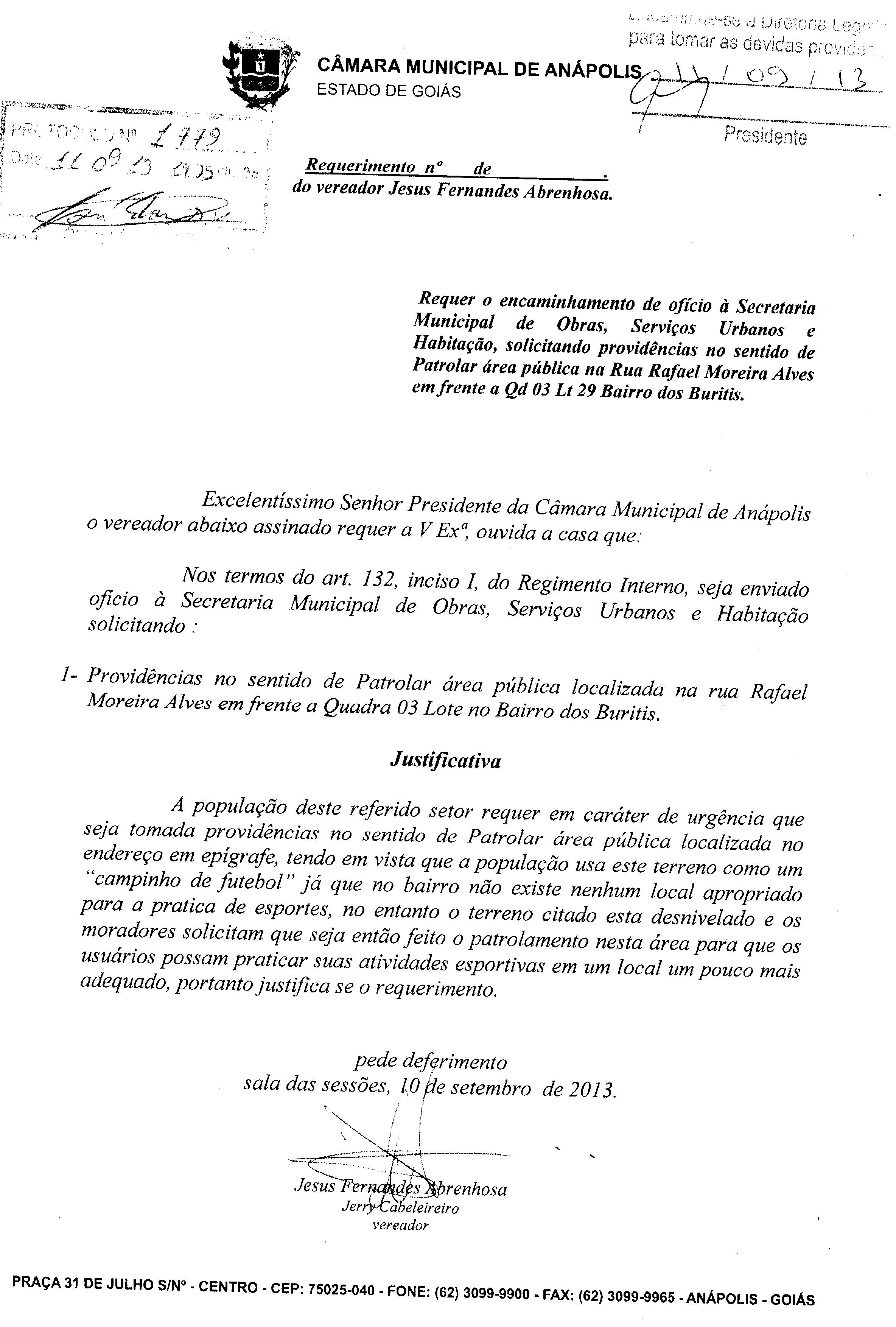 Ementa: À SECRETARIA MUNICIPAL DE OBRAS, SERVIÇOS URBANOS E HABITAÇÃO SOLICITANDO: PROVIDÊNCIAS NO SENTIDO DE PATROLAR ÁREA PÚBLICA LOCALIZADA NA RUA RAFAEL MOREIRA ALVES EM FRENTE A QUADRA 03 LOTE NO BAIRRO DOS BURITIS.