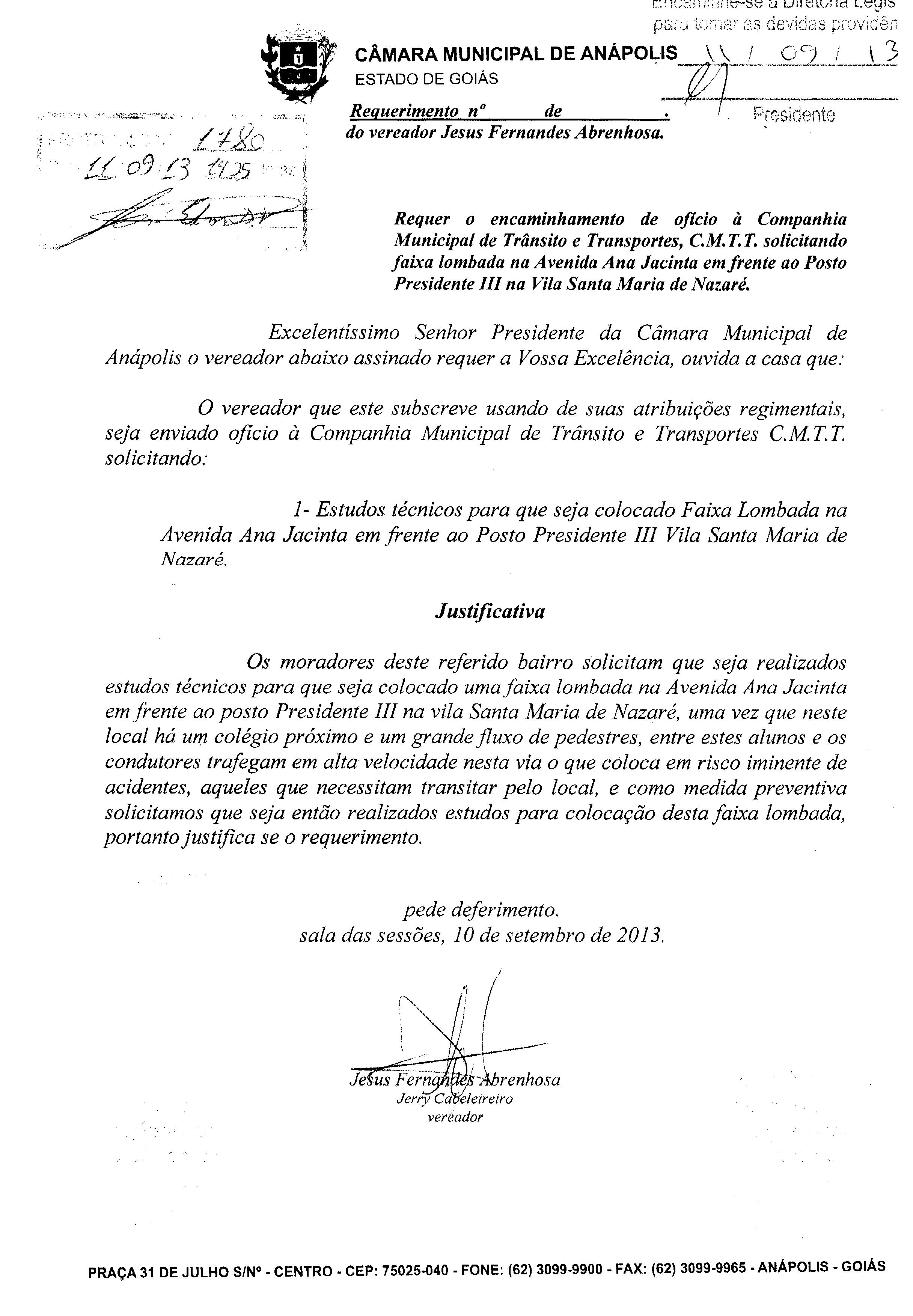 Ementa: À COMPANHIA MUNICIPAL DE TRÂNSITO E TRANSPORTES C.M.T.T. SOLICITANDO: ESTUDOS TÉCNICOS PARA QUE SEJA COLOCADO FAIXA LOMBADANA AVENIDA ANA JACINTA EM FRENTE AO POSTO PRESIDENTE III VILA SANTA MARIA DE NAZARÉ.