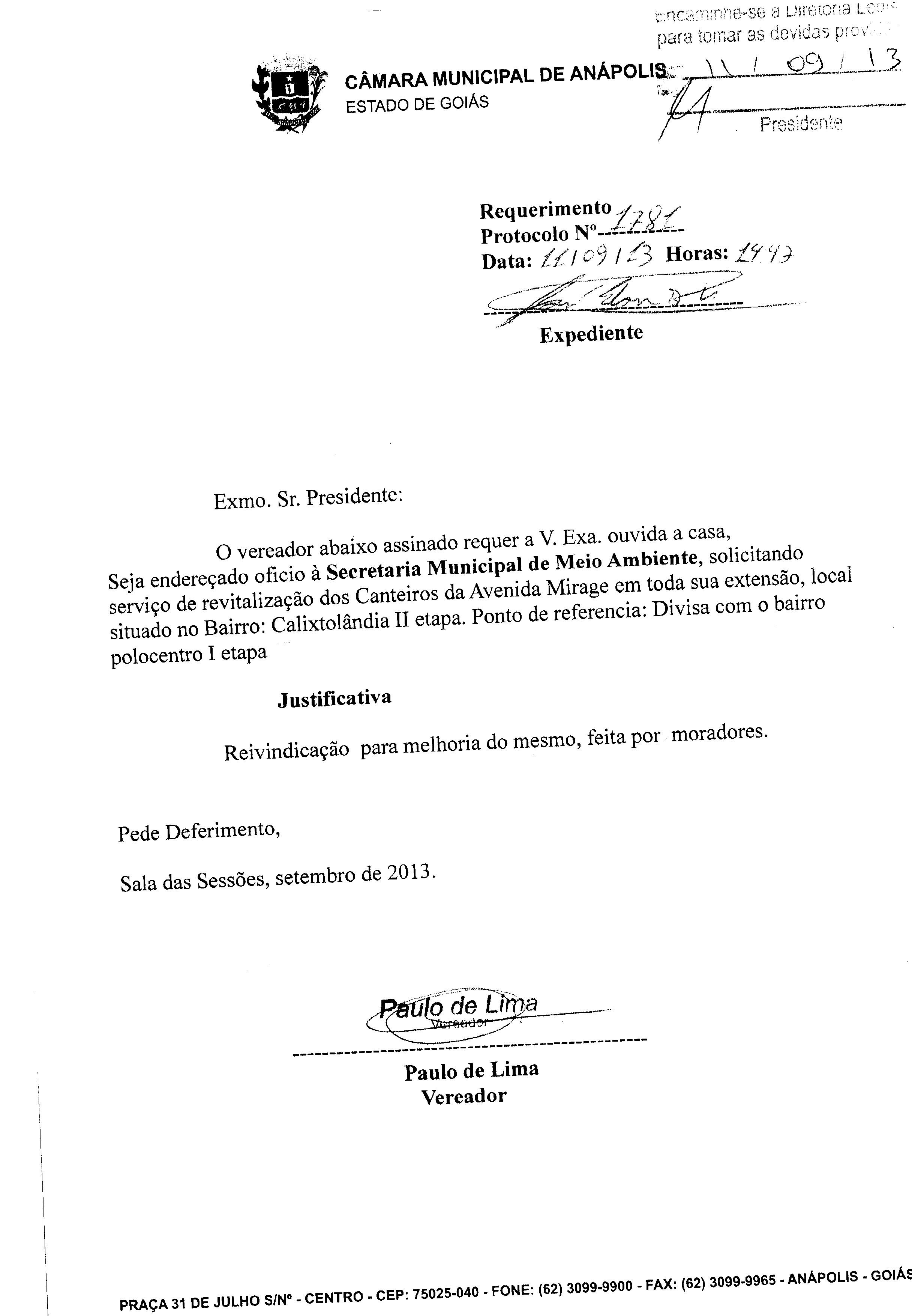 Ementa: À SECRETARIA MUNICIPAL DE MEIO AMBIENTE, SOLICITANDO SERVIÇO DE REVITALIZAÇÃO DOS CANTEIROS DA AVENIDA MIRAGE EM TODA SUA EXTENSÃO, LOCAL SITUADO NO BAIRRO: CALIXTOLÂNDIA II ETAPA. PONTO DE REFERENCIA: DIVISA COM BAIRRO POLOCENTRO I ETAPA.