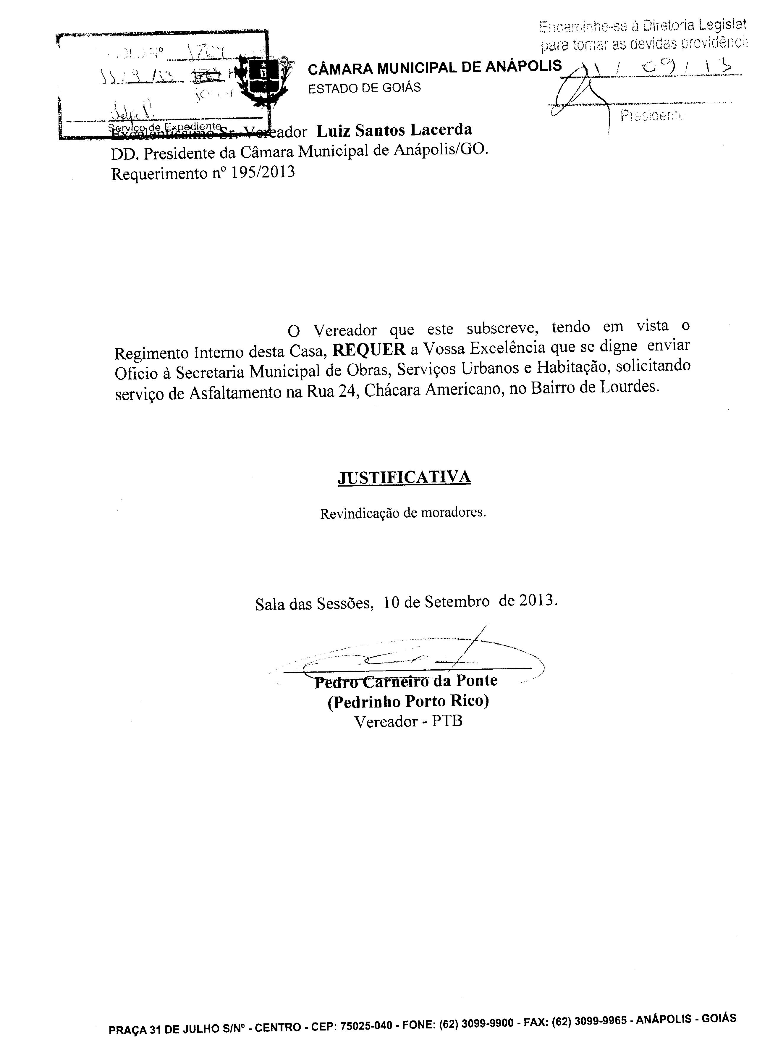 Ementa: À SECRETARIA MUNICIPAL DE OBRAS, SERVIÇOS URBANOS E HABITAÇÃO, SOLICITANDO SERVIÇO DE ASFALTAMENTO NA RUA 24, CHÁCARA AMERICANO, NO BAIRRO DE LOURDES.