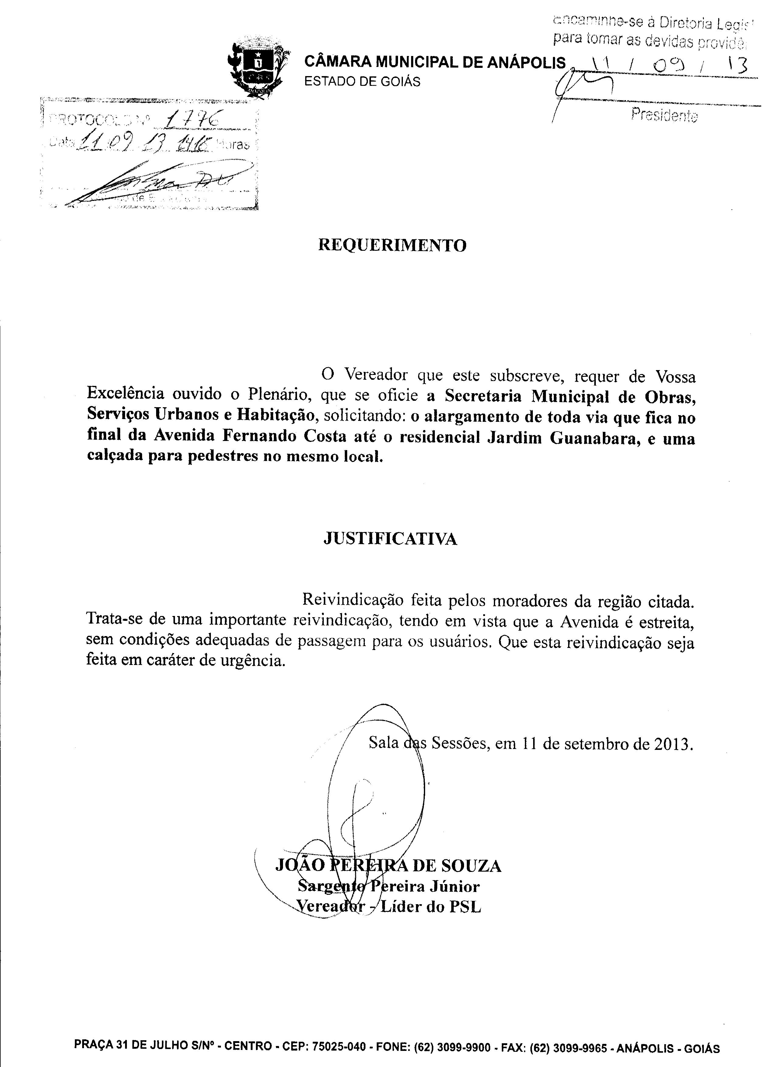 Ementa: À SECRETARIA MUNICIPAL DE OBRAS, SERVIÇOS URBANOS E HABITAÇÃO, SOLICITANDO: O ALARGAMENTO DE TODA VIA QUE FICA NO FINAL DA AVENIDA FERNANDO COSTA ATÉ O RESIDENCIAL JARDIM GUANABARA, EM UMA CALÇADA PARA PEDESTRES NO MOMENTO LOCAL.